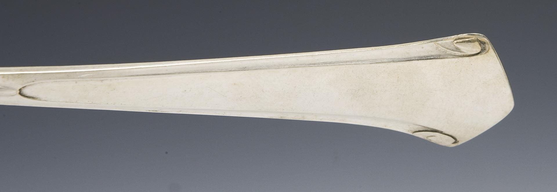 Modell von Peter Behrens (1868-1940) um 1903, Besteck-Muster-Nr. 6200. 90 Teile: 18 Messer, 18 Gabeln, 18 Esslöffel, 5 Menü-Messer, 6 Menü-Gabeln, 6 Fischmesser, 6 Fischgabeln, 6 Kaffeelöffel, 6 Mokkalöffel, 1 Soßenkelle. Gravierte Monogramme, Messer mit rostfreien Stahlklingen von Eduard Wüsthof, Solingen und Friodur (Marke von Zwillingswerk J. A. Henckels, Solingen). Punzen: Halbmond und Krone, Feingehalt, Fabrikmarke, verschiedene Händlersignaturen.