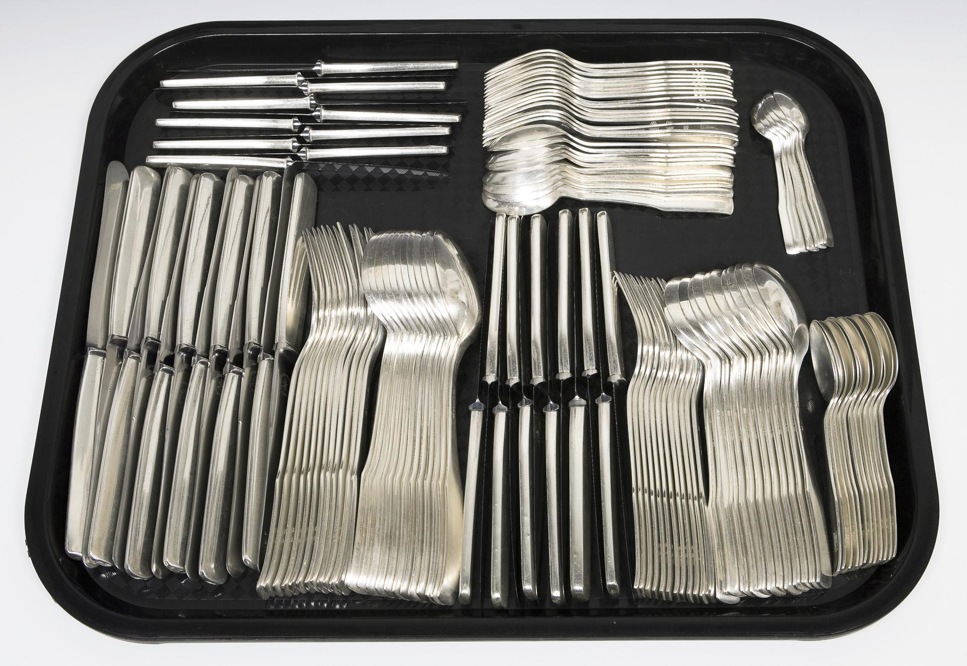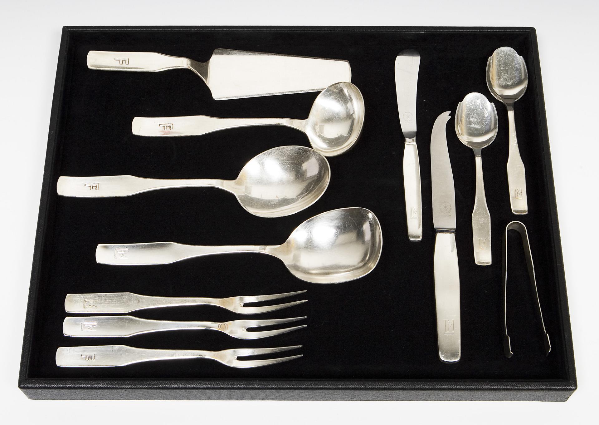 Modell von Hermann Gretsch (1895-1950), nach seinem Tod von Wilhelm Wagenfeld fertiggestellt. Besteck-Muster-Nr. 83. 138 Teile: 12 Messer, 12 Gabeln, 12 Esslöffel, 12 Menü-Messer, 12 Menü-Gabeln, 12 Menü-Löffel, 10 Obstmesser, 16 Kuchengabeln, 12 Kaffeelöffel, 10 Dessert-Löffel, 6 Mokkalöffel, 1 Zuckerzange, 2 Pastetenheber, 1 Tortenheber, 1 Soßenkelle, 2 verschiedene Servier-Löffel, 3 Fleischgabeln, 1 Buttermesser, 1 Käsemesser. Design-Klassiker, massive qualitätvoller Arbeit, gravierte und reliefierte Monogramme F, LM, einige Teile ohne Monogramm. Messer mit originalen rostfreien Stahlklingen. Punzen: Halbmond und Krone, Feingehalt, Fabrikmarke.