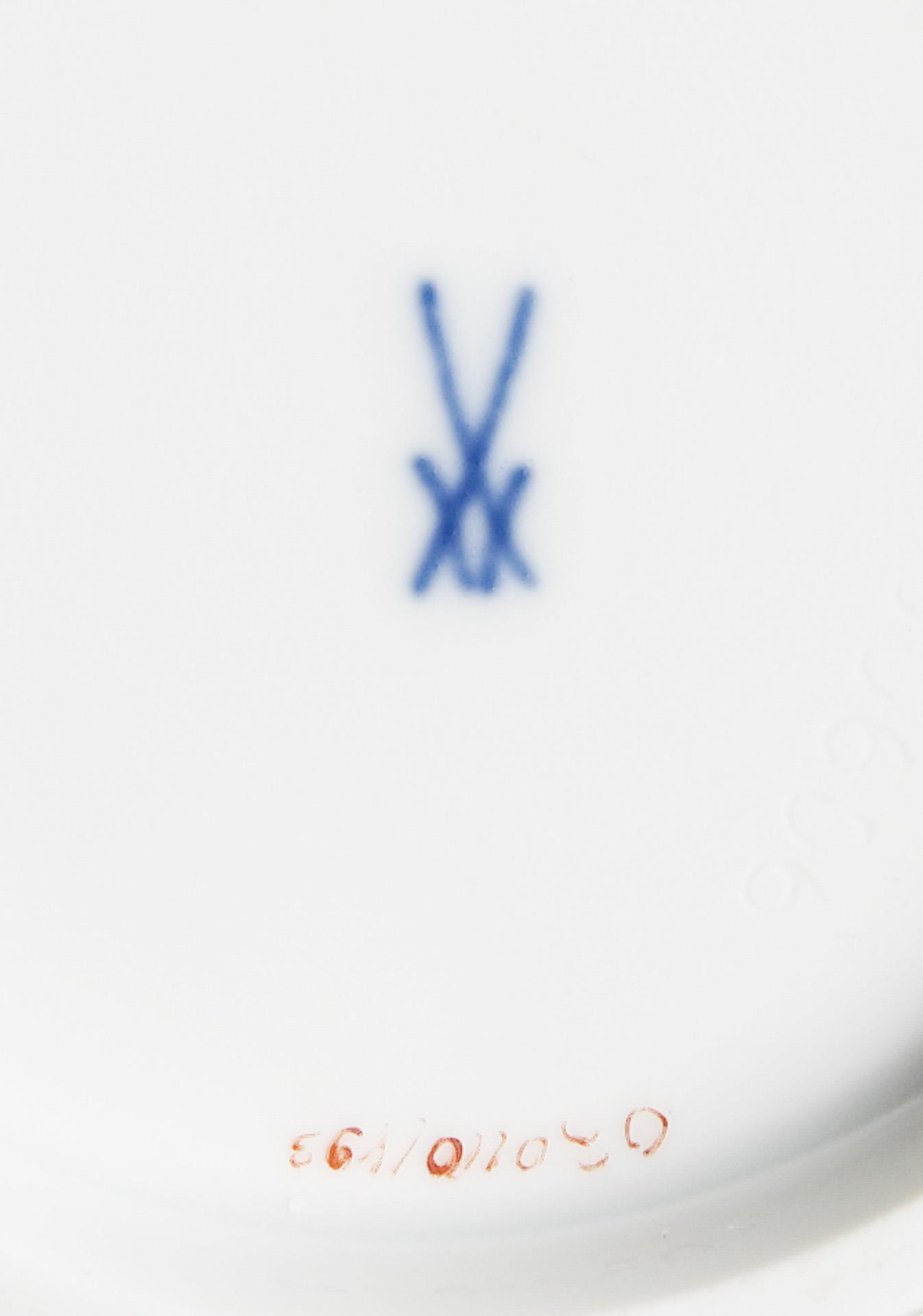 4 Teile: großes Tablett, Konfektschale, Kerzenleuchter, Cachepot. Farbige Bemalung, Goldstaffage, Dekor "Rote Rose". Pressmarken, Ritzmarken, Malermarken, Schwertermarken, Cachepot einmal gestrichen.