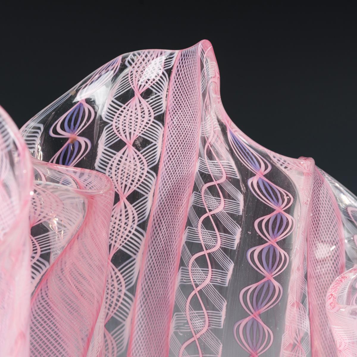 Farbloses Glas mit eingeschmolzenen Zanfirico-Stäben aus rosafarbenem und opalweißem Glas. H 23,5 cm, Ø 24,5 cm.