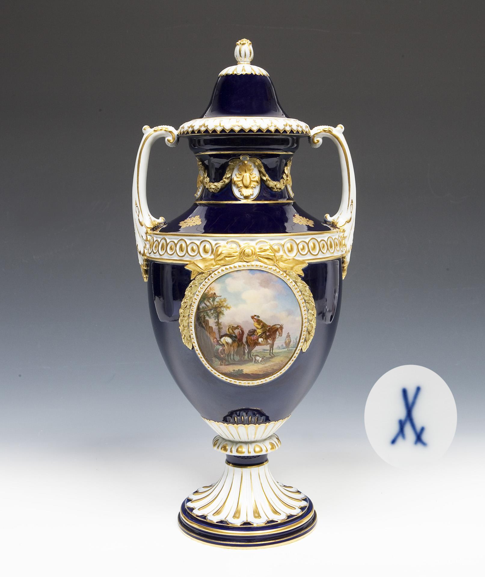 Modell von Ernst August Leuteritz und Mitarbeiter 1876-1880. Frontal feine farbige Bemalung nach einer Gemälde-Vorlage von Philips Wouwerman (1619 Haarlem - 1668 Haarlem). Rückseitig farbig gemaltes Blumenbukett. Umlaufend floral und ornamental reliefiert, Dekor mit Lorbeerblatt-Festons, Rosetten und bekrönenden Schleifen. Auf der Schulter vier gemalte Ornamente in Gold, reiche Goldstaffage. Ritzmarke, Pressmarke, Schwertermarke. Standfuß, eine Blattspitze minimal bestoßen.