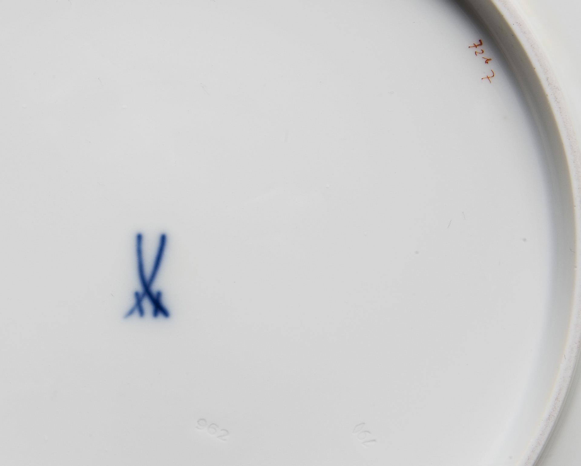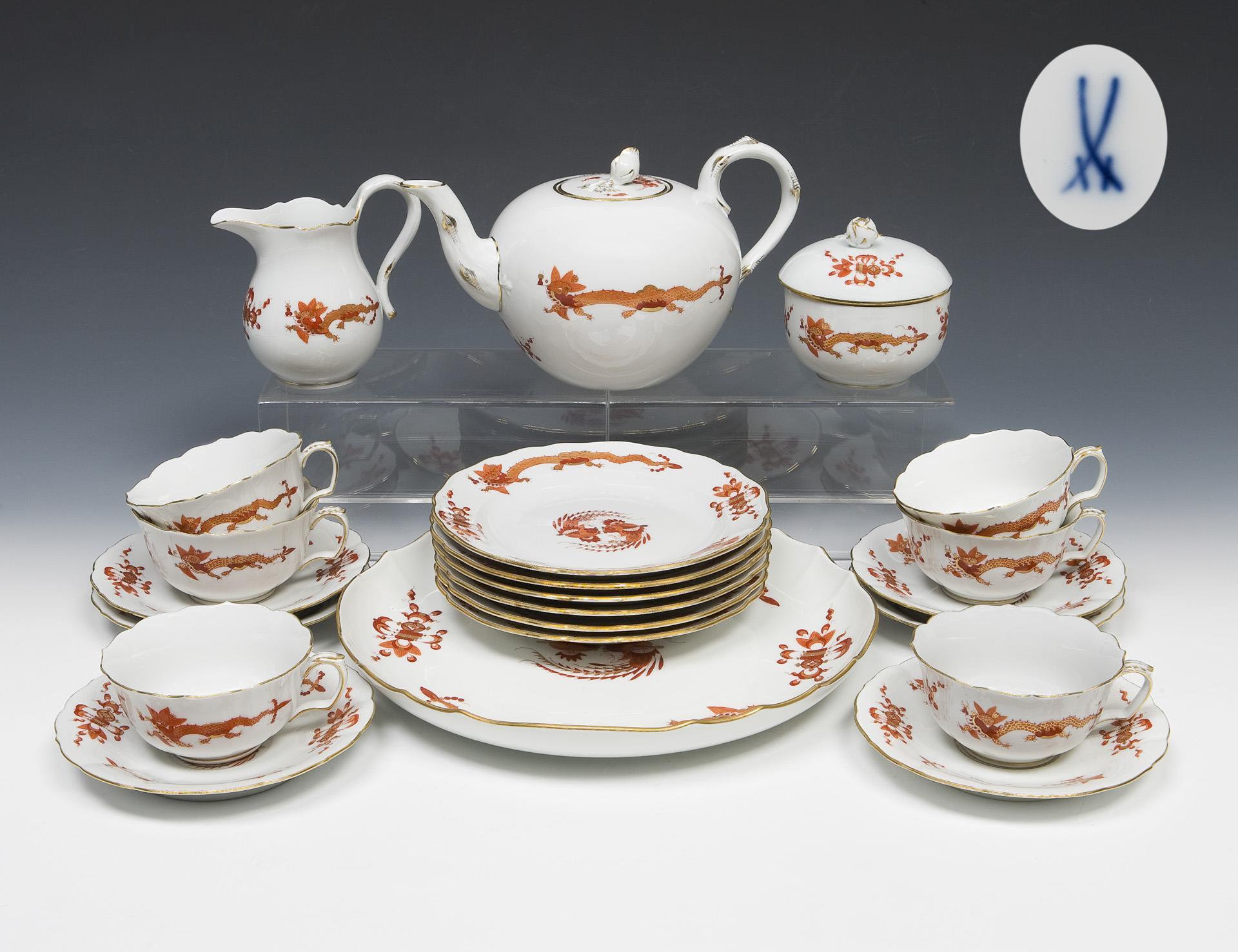 Form "Neuer Ausschnitt", Camaieu-Malerei in Eisenrot, gold schattiert, gold staffiert, "Drachendekor". 22 Teile: Teekanne, Milchkännchen, Zuckerdose, Kuchenschale, 6 Teetassen, 6 Untertassen, 6 Dessertteller. Pressmarken, Malermarken, Schwertermarken, eine Tasse dreimal gestrichen. Eine Rose, ein Standring, ein Rand minimal bestoßen.