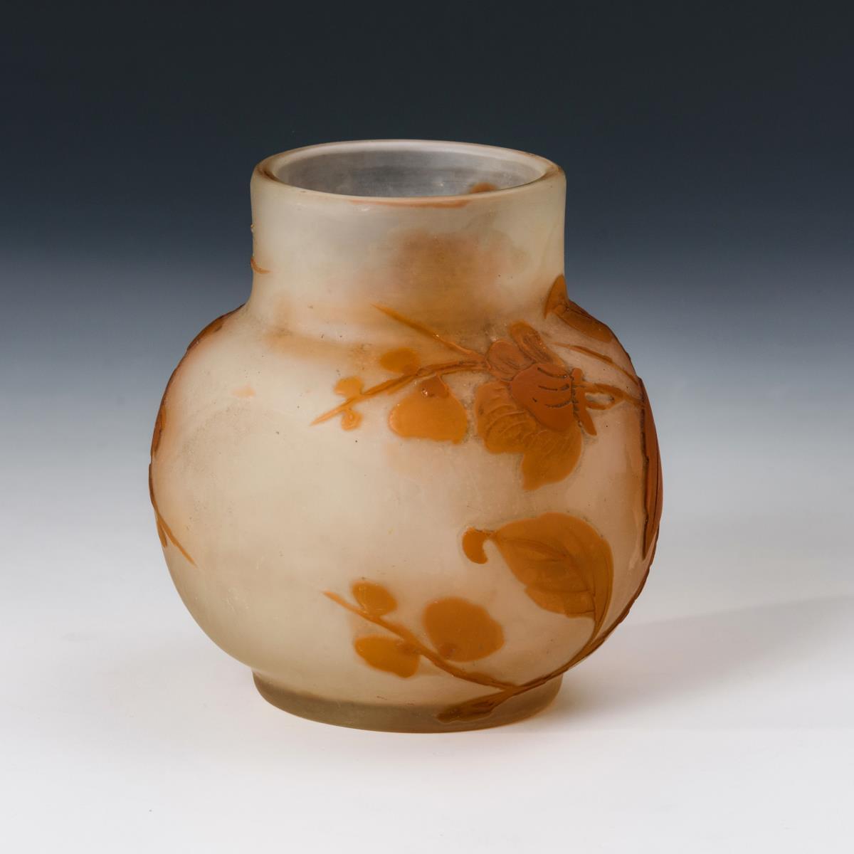 Farbloses, mattiertes Glas mit orangefarbenem Überfang, Ätzdekor. H 9 cm.
