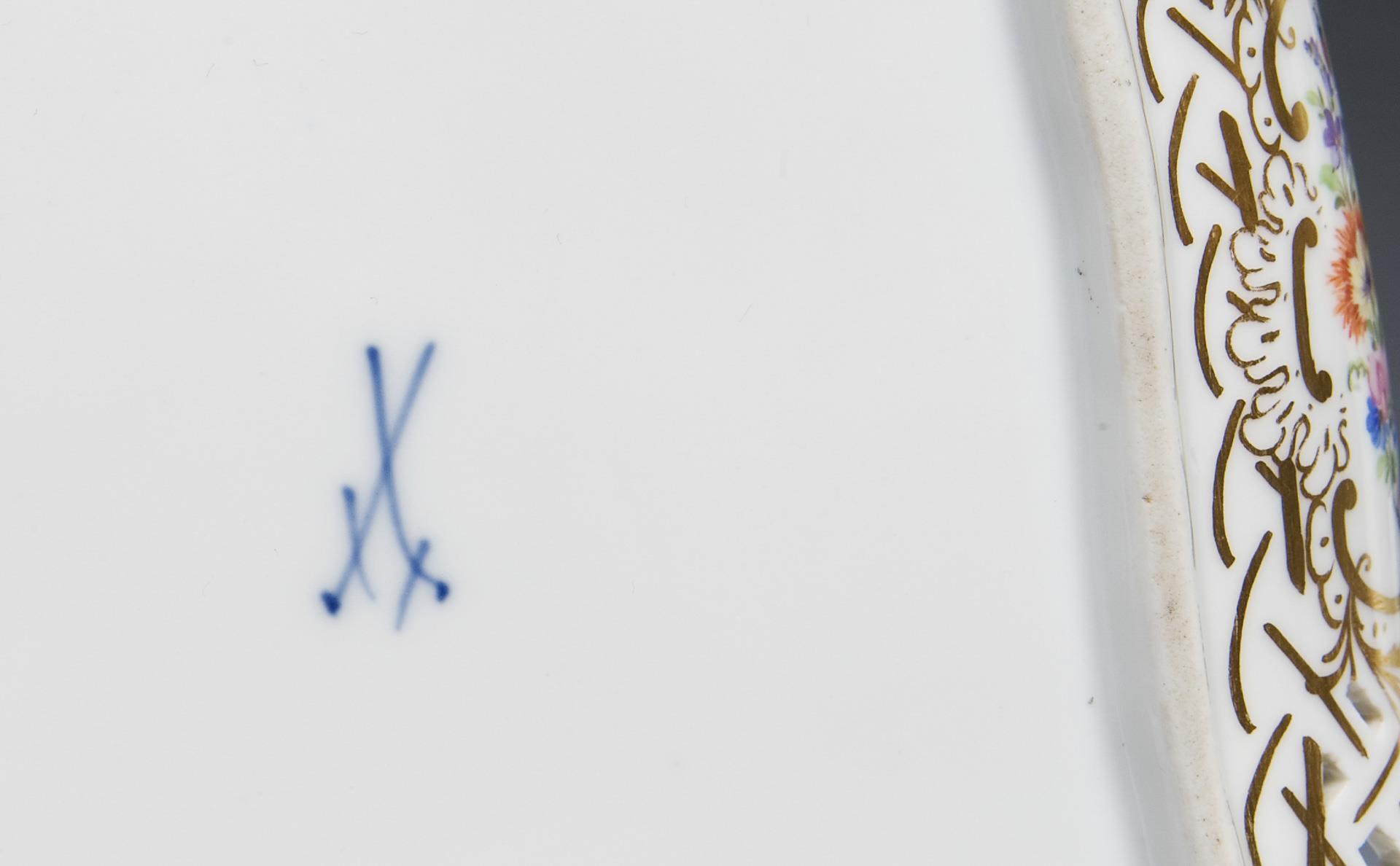 Farbig bemalt, gold staffiert, Dekor "Blumen und Insekten", Schale beidseitig bemalt. Die durchbrochen gearbeitete Fahne mit jeweils drei oder vier Reliefkartuschen. Pressmarken, Schwertermarken.
