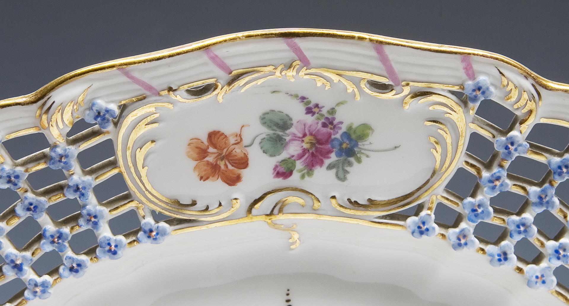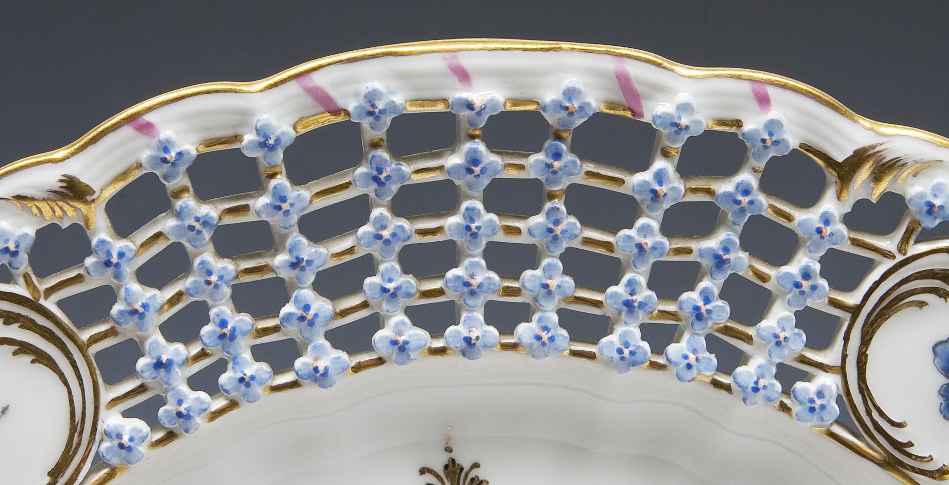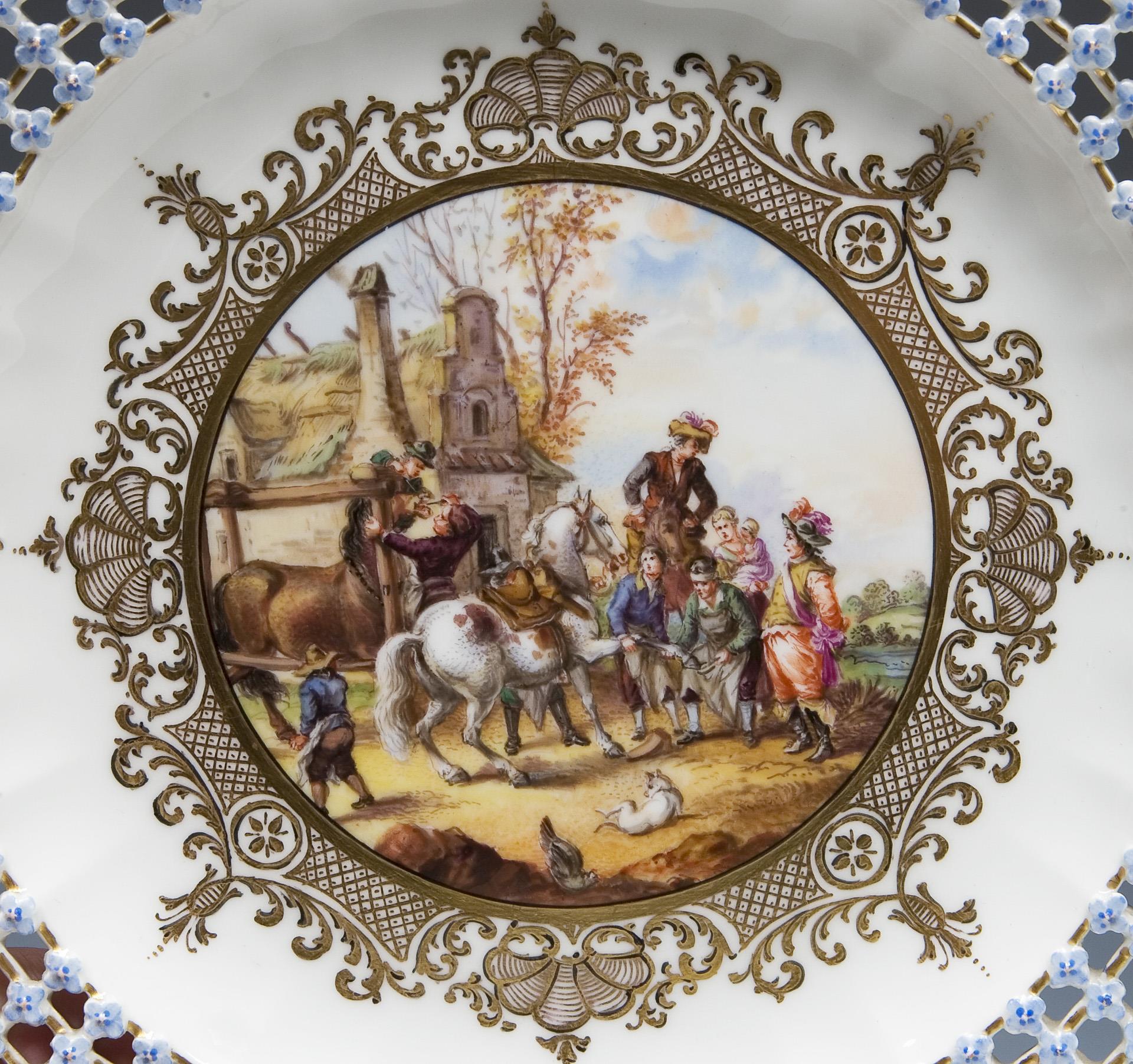 Form-Modell und Malerei nach Meissner Vorbild, die durchbrochen gearbeitete Fahne mit aufgelegten, blau staffierten Vergissmeinnicht-Blüten und vier Reliefkartuschen. Farbige Bemalung mit Blumenbuketts in den Kartuschen, im Spiegel schwarz konturierte breite Goldreserven mit Gitterwerk, feine farbige Genremalerei nach Altmeister-Gemäldevorlagen, Goldstaffage. Pressmarken, blaue Zeptermarken einmal gestrichen.