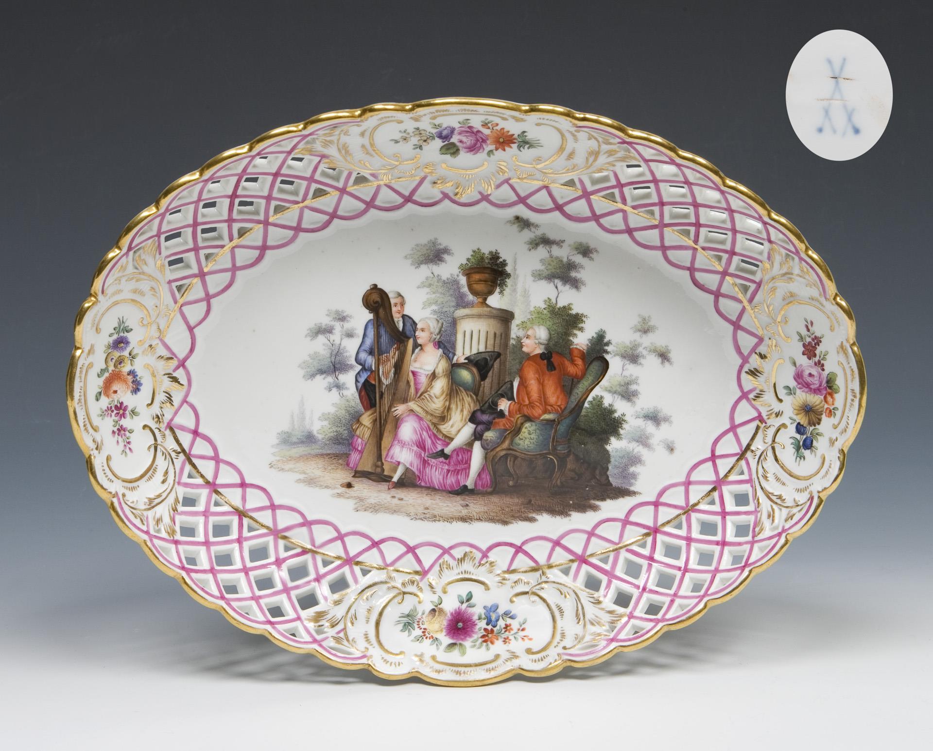 Die durchbrochen gearbeitete Fahne mit vier Reliefkartuschen und farbig gemalten Blumenbuketts. Im Spiegel großflächige feine farbige Bemalung mit eleganter Genreszene "Höfische Gesellschaft im Park", purpur und gold staffiert. Pressmarke, Schwertermarke zweimal gestrichen. Glasurdefekte, Standring minimal bestoßen.