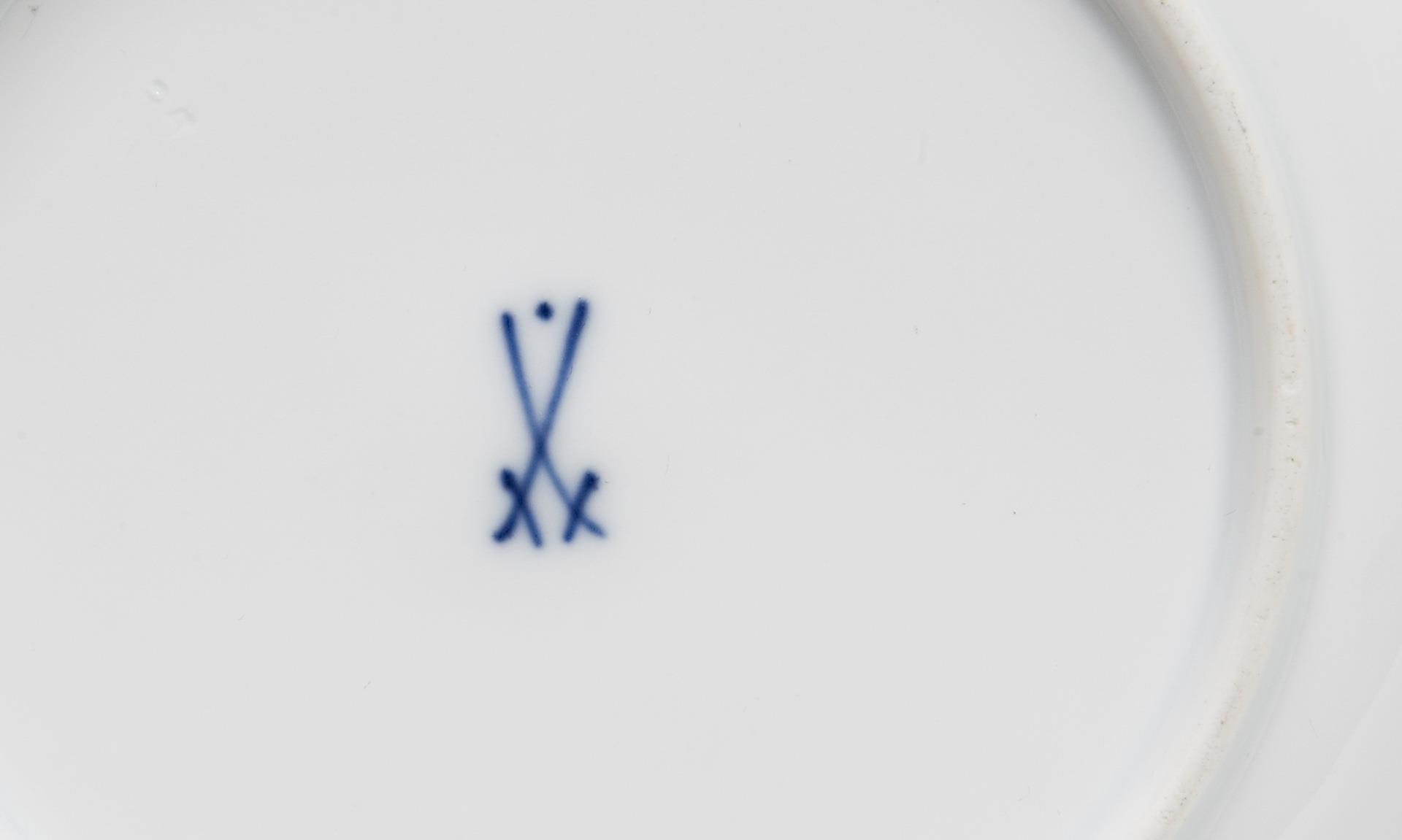 Reliefierte Rocaillen-Kartuschen mit Symbolen der Wissenschaft, der Kunst und des militärischen Triumphes im Wechsel mit Blütenzweigen. Bemalung in Eisenrot und Gold mit Schuppenrand, Zahnkante und indianischen Blütenzweigen. Pressmarken, Schwertermarken mit Punkt.