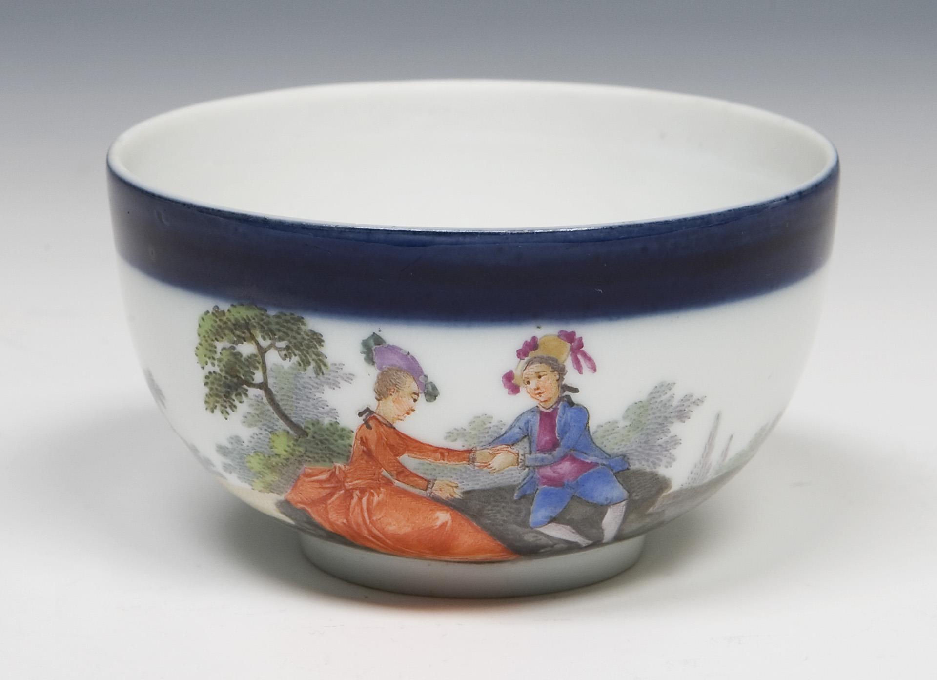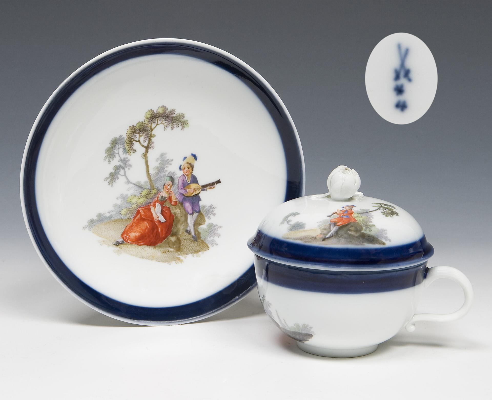 Kobaltblaue Ränder, farbige Bemalung mit drei verschiedenen Genreszenen nach Vorlagen von Jean Antoine Watteau (1684-1721). Halbkugelige Tasse mit geschweiftem Ohrenhenkel, gewölbter Deckel mit plastischem Blütenknauf, glatte Ränder. Pressmarken, Schwertermarken mit Stern und Malermarke 4.