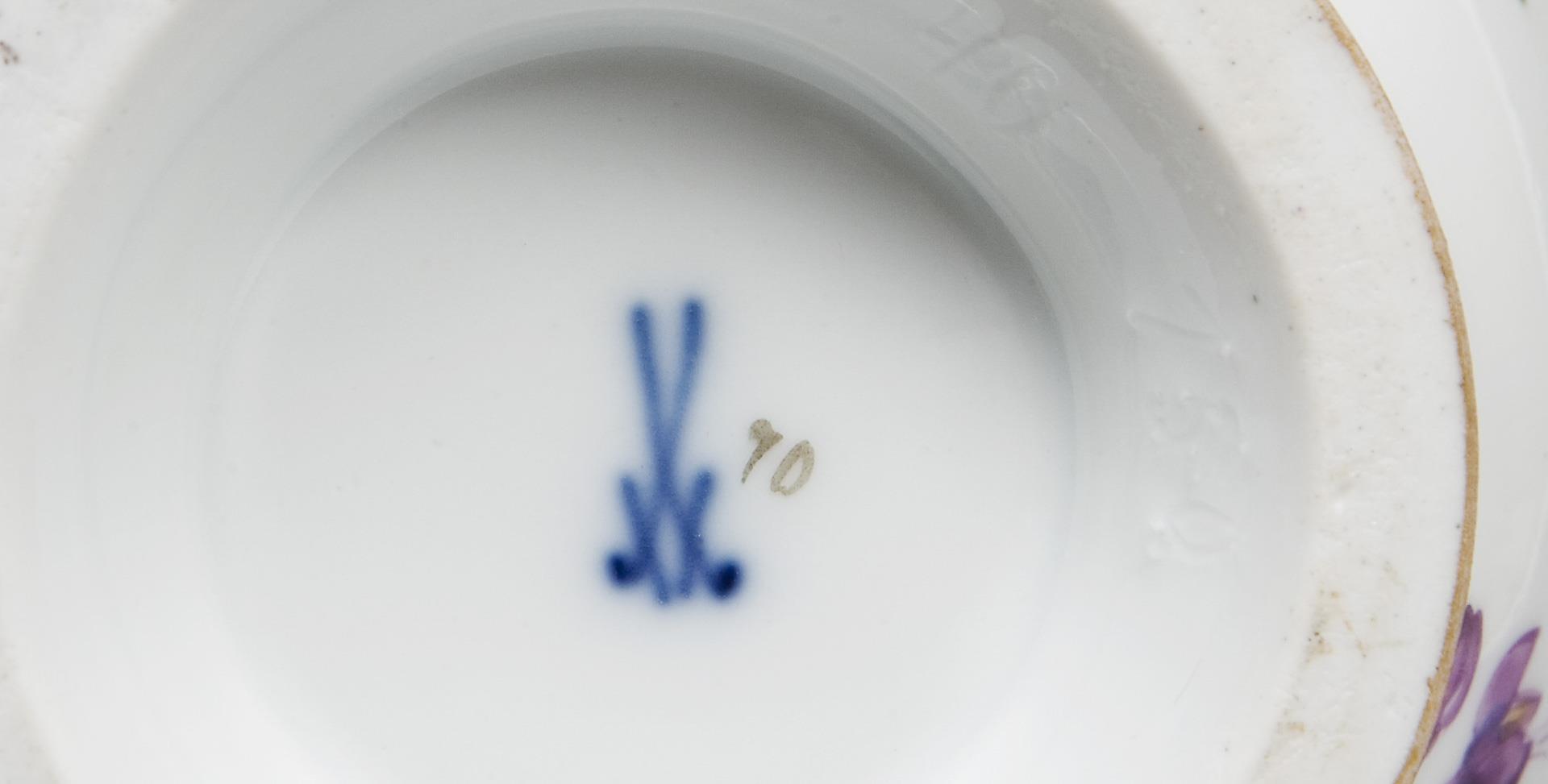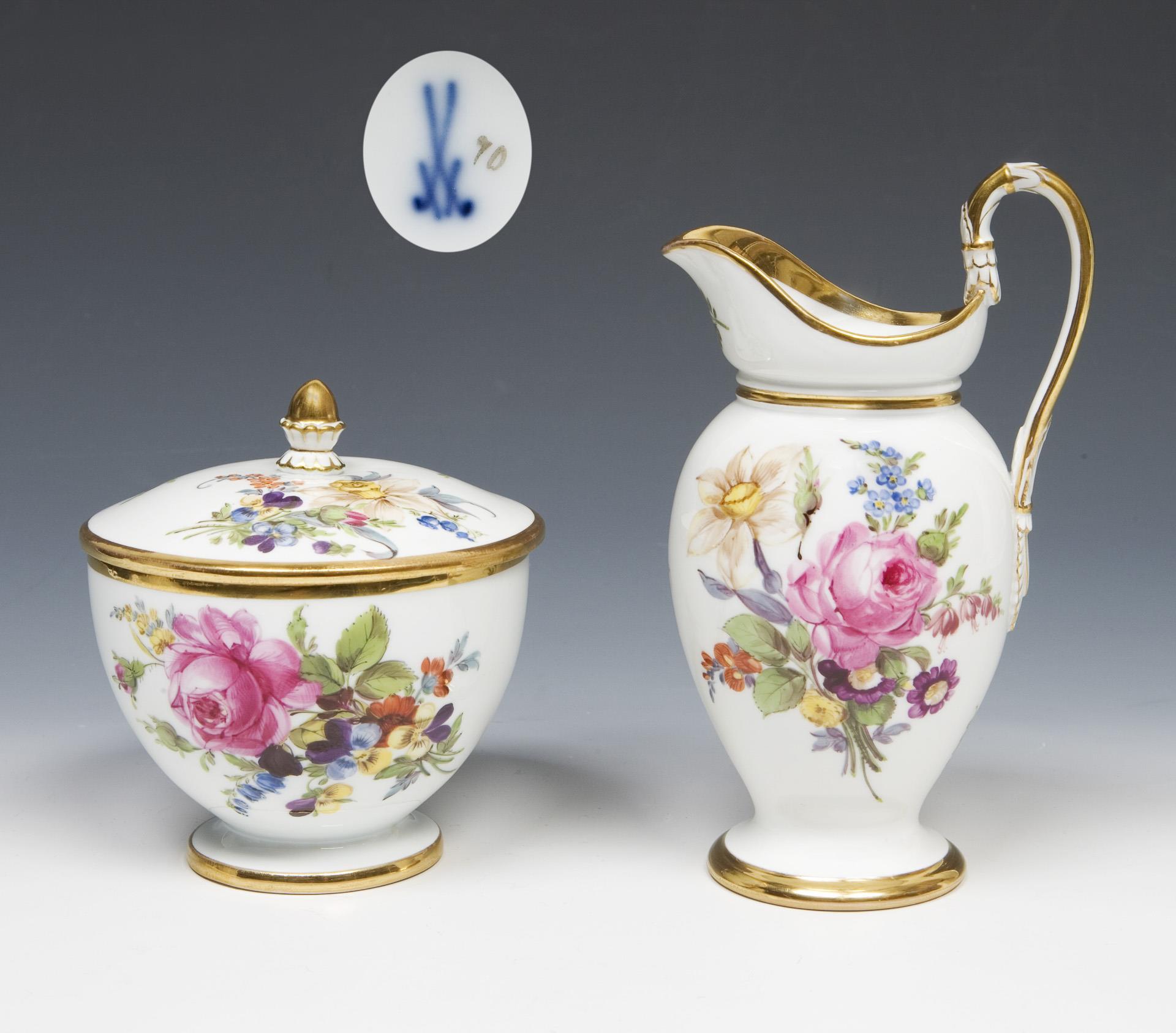 Ein typisches Biedermeier-Ensemble, "T-Form", umlaufend farbige Blumenbemalung mit üppigen Buketts und Einzelblüten, Goldstaffage. Ritzmarken, Schwertermarken.
