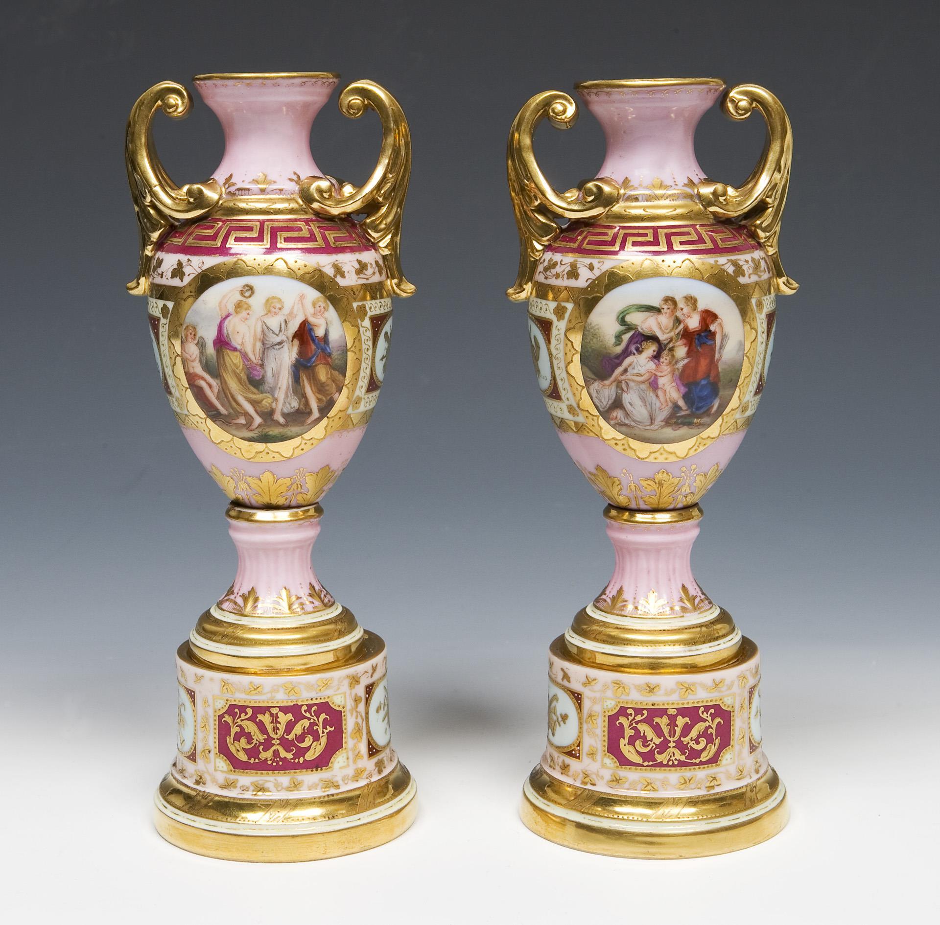 Reiches Ornamentdekor in Reliefgold über farbigen Fondreserven im Alt-Wiener-Stil. Beidseits feine farbige Bemalung nach Gemälde-Vorlagen von Angelika Kauffmann (1741-1807) "Cephisa trifft auf Amor", "Schlafende Nymphe", "Amor streitet mit den drei Grazien um seine Pfeile", "Tanzende Grazien", reiche Goldstaffage, montierte runde Plinthen. Pseudo-Bindenschildmarke. Kleiner Brandriss am Henkel.
