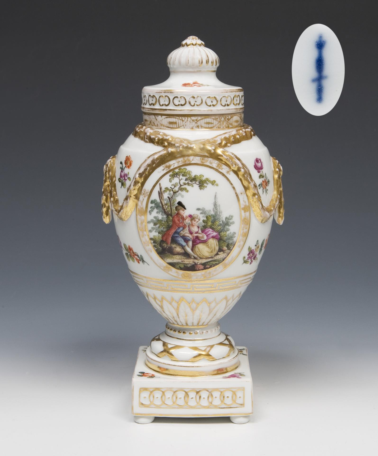 Ornamentales Reliefdekor mit Lorbeerblatt-Festons, farbig bemalt, gold staffiert. Beidseits zwischen gestreuten Blüten Ovalreserven mit fein gemalten Genreszenen im Stil des französischen Rokoko. Blaue Zeptermarke. Gold berieben.