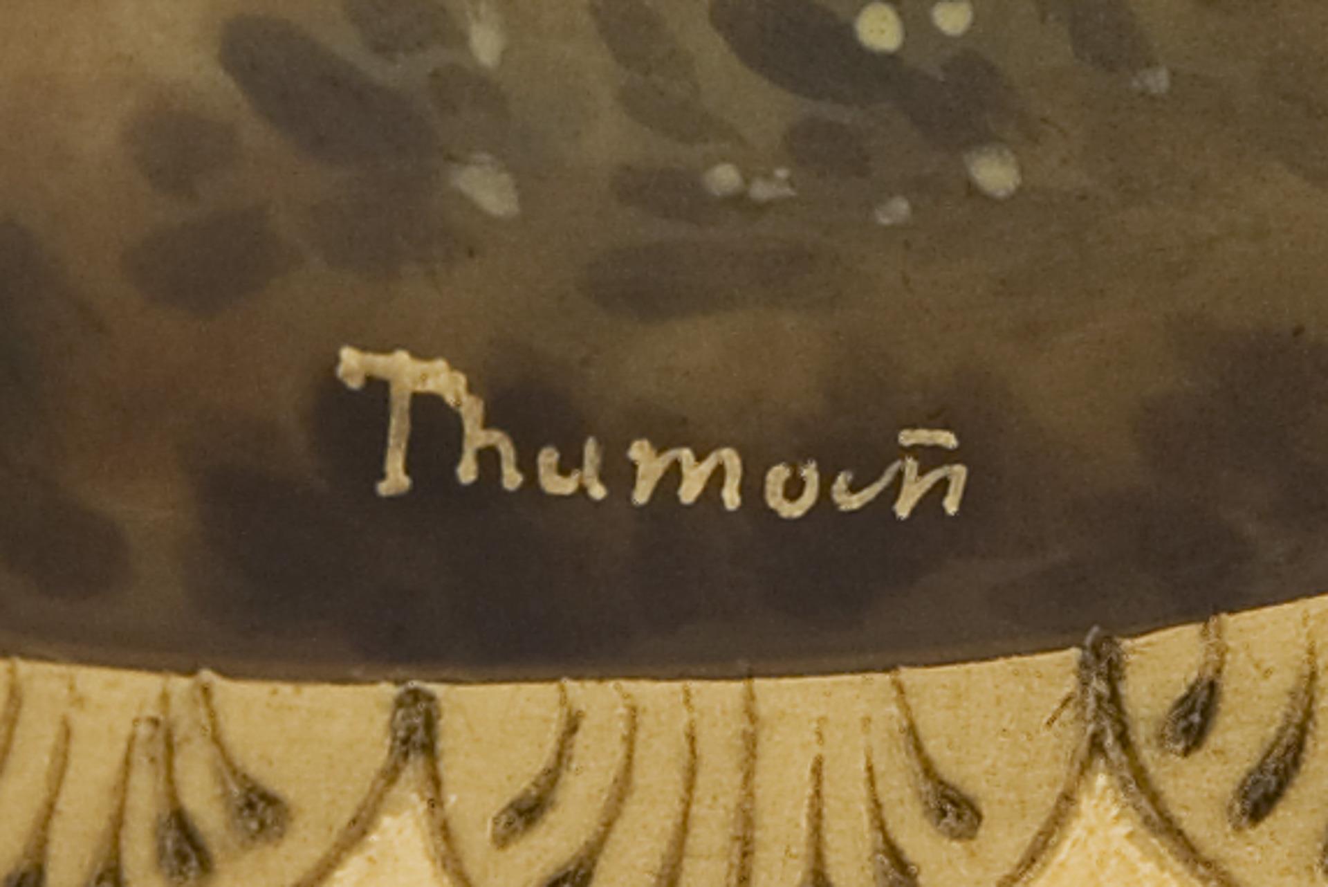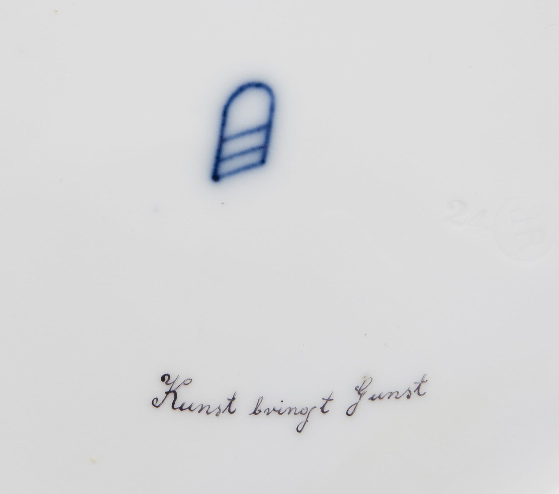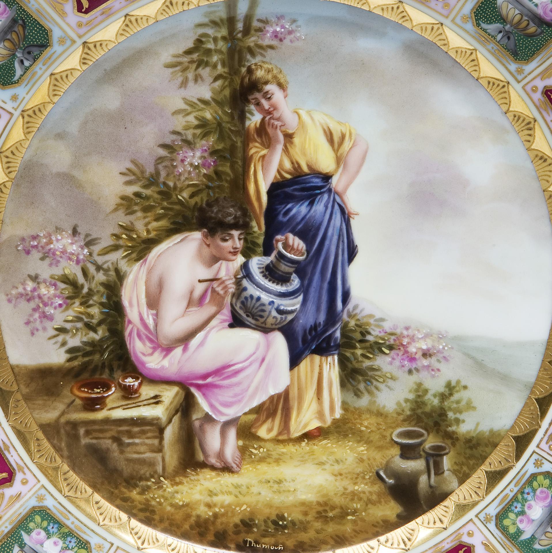 Scherben von Hutschenreuther, Selb. Reiches Ornamentdekor in Reliefgold über farbigen Fondreserven im Alt-Wiener-Stil. Auf der Fahne vier farbig gemalte Schalen mit Rosen und Vergissmeinicht-Blüten. Im Spiegel sehr feine farbige Bemalung "Kunst bringt Gunst" frei nach der Gemälde-Vorlage von Paul Thumann (1834 Großschacksdorf - 1908 Berlin). Pseudo Bindenschildmarke, Pressmarke, schwarzer Titel. Gold partiell leicht berieben.