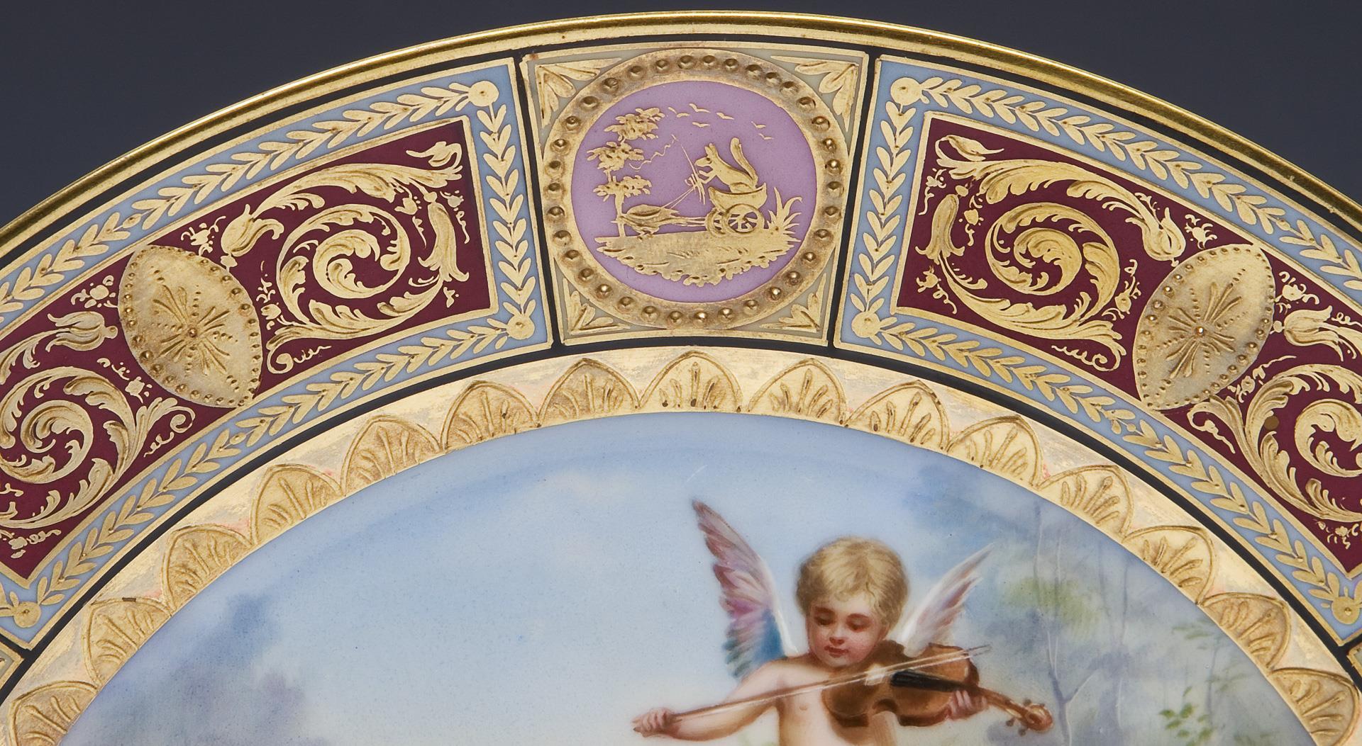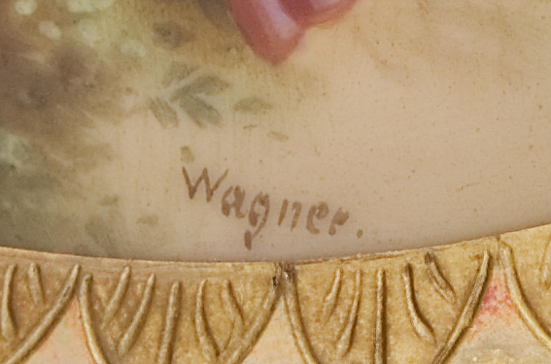 Reiches Ornamentdekor mit Landschaftsinseln in Reliefgold über farbigen Fondreserven im Alt-Wiener-Stil. Im Spiegel sehr feine farbige Bemalung, Wagner signiert "Allegorie-Die Musik" nach einer Gemälde-Vorlage von Vojtêch Hynais (1854 Wien - 1925 Prag). Pseudo-Bindenschildmarke, roter Titel, rote Malernummer.