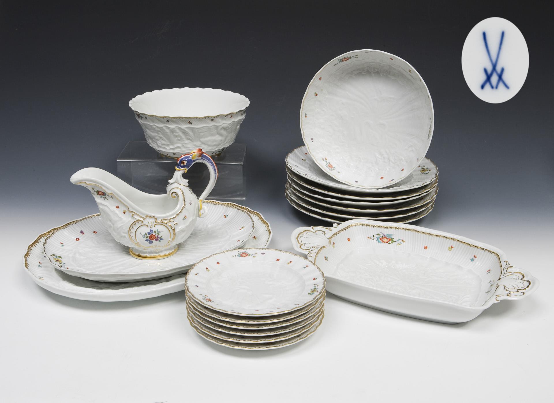 Modell von Johann Joachim Kaendler und Johann Friedrich Eberlein 1737-1741. Die gesamte Oberfläche reliefiert, auf gewellten Muschelrippen Schwäne und Reiher, im Wasser Schilfstauden, Muscheln und Weinblätter. Dekor-Nr. 397152, farbige Bemalung mit indianischen Blumen, farbig und gold staffiert. Sauciere mit hochgestelltem Delphin-Henkel. 18 Teile: 2 Speiseplatten, 1 Henkelschale, 1 Sauciere, 1 runde Schale, 1 Schüssel, 6 Essteller, 6 Dessertteller. Pressmarken, Malermarken, Schwertermarken, eine Speiseplatte 1924-1934, eine Schwertermarke mit Punkt.