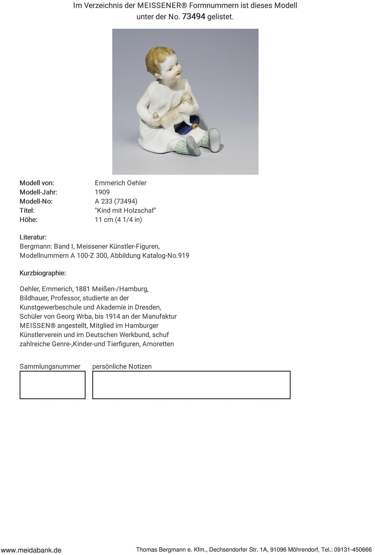 Oehler, Bildhauer, Professor, 1902-1914 an der Manufaktur angestellt, schuf zahlreiche Genre-, Kinder- und Tierfiguren. Meissen-Manufaktur-Preis: 2190,- Euro * Partnerauktion Bergmann.
