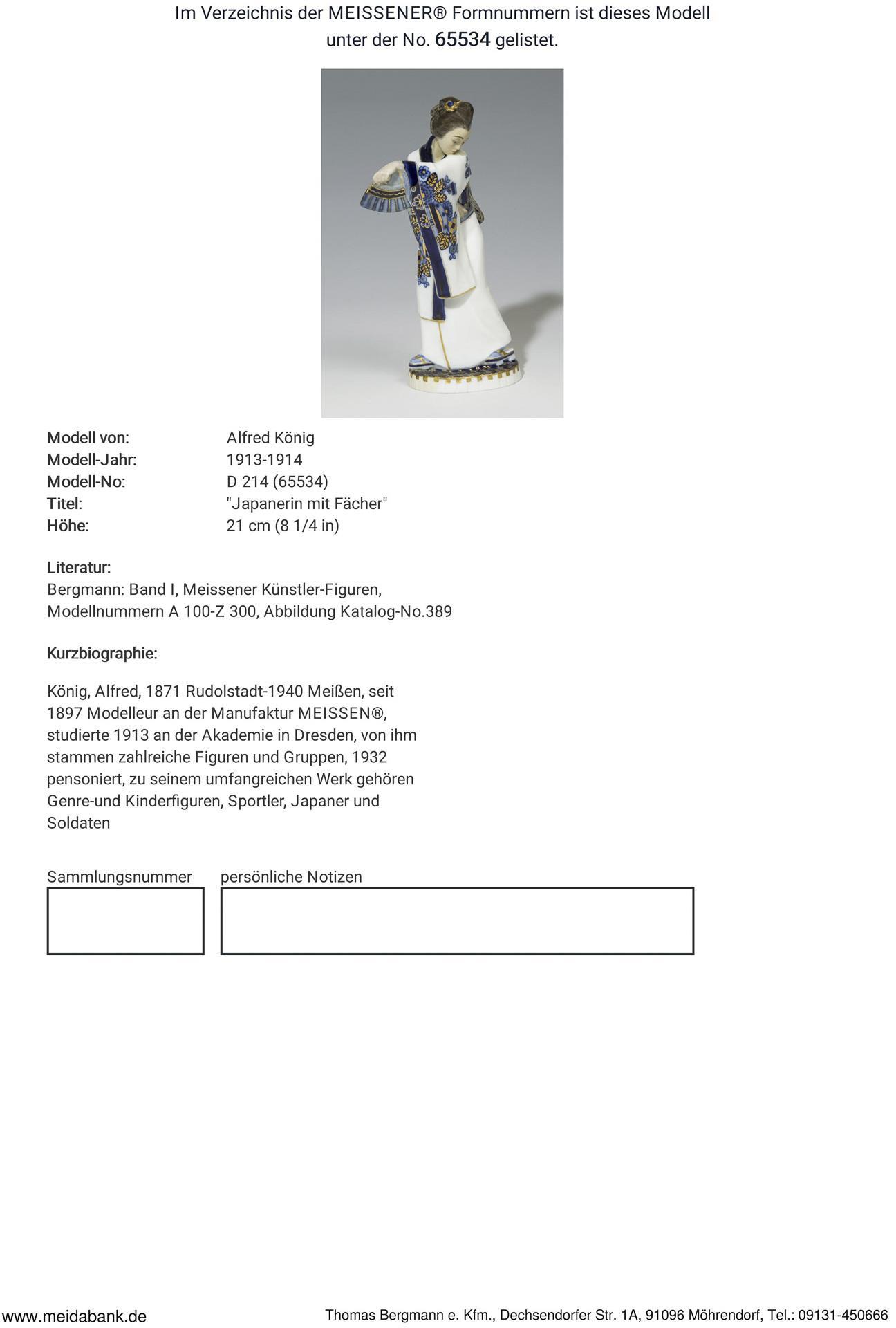 König, 1871-1940, seit 1897 Modelleur an der Manufaktur, studierte an der Akademie in Dresden. Von ihm stammen zahlreiche Genre-Figuren und Gruppen, 1932 pensoniert. Meissen-Manufaktur-Preis: 8490,- Euro * Partnerauktion Bergmann.