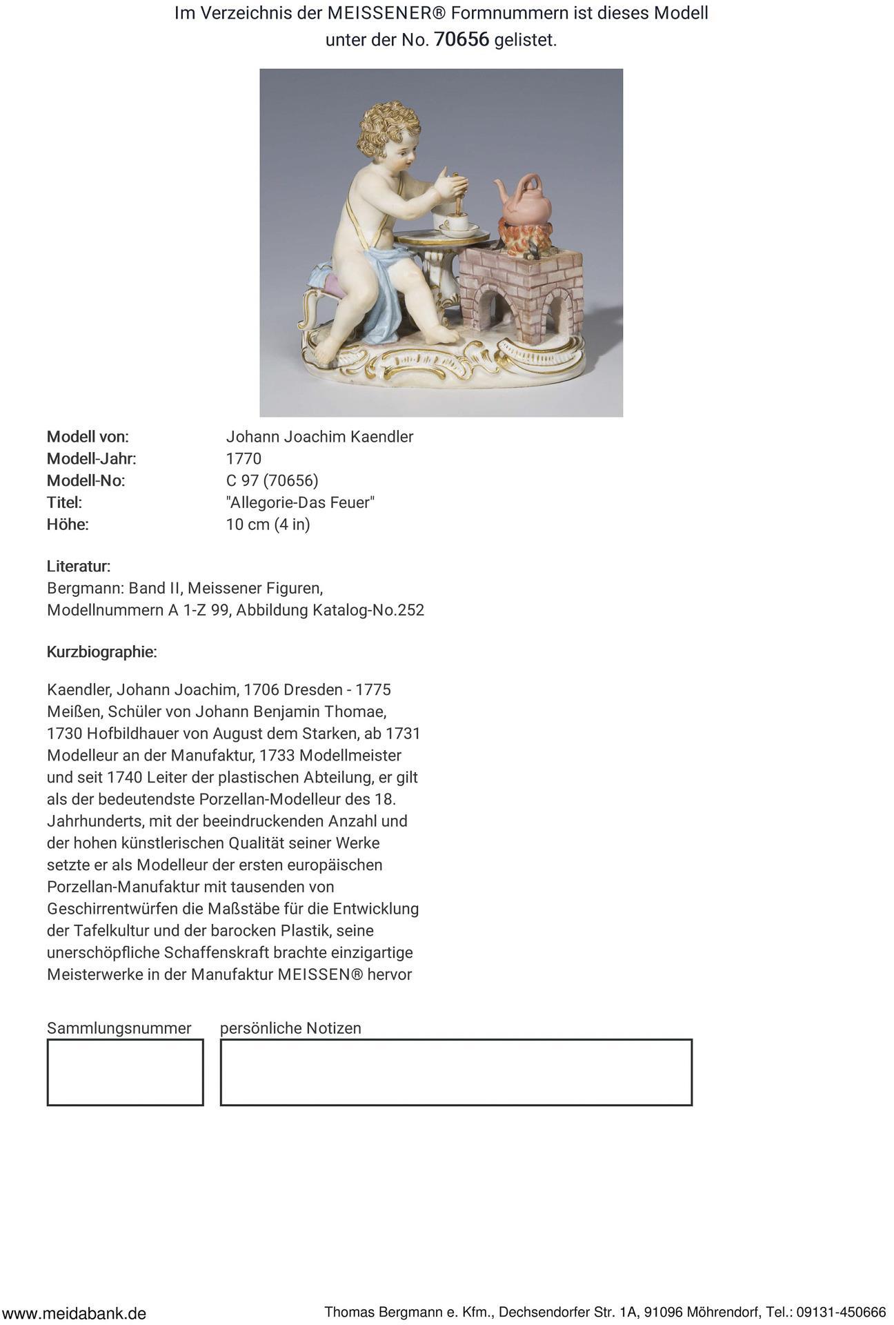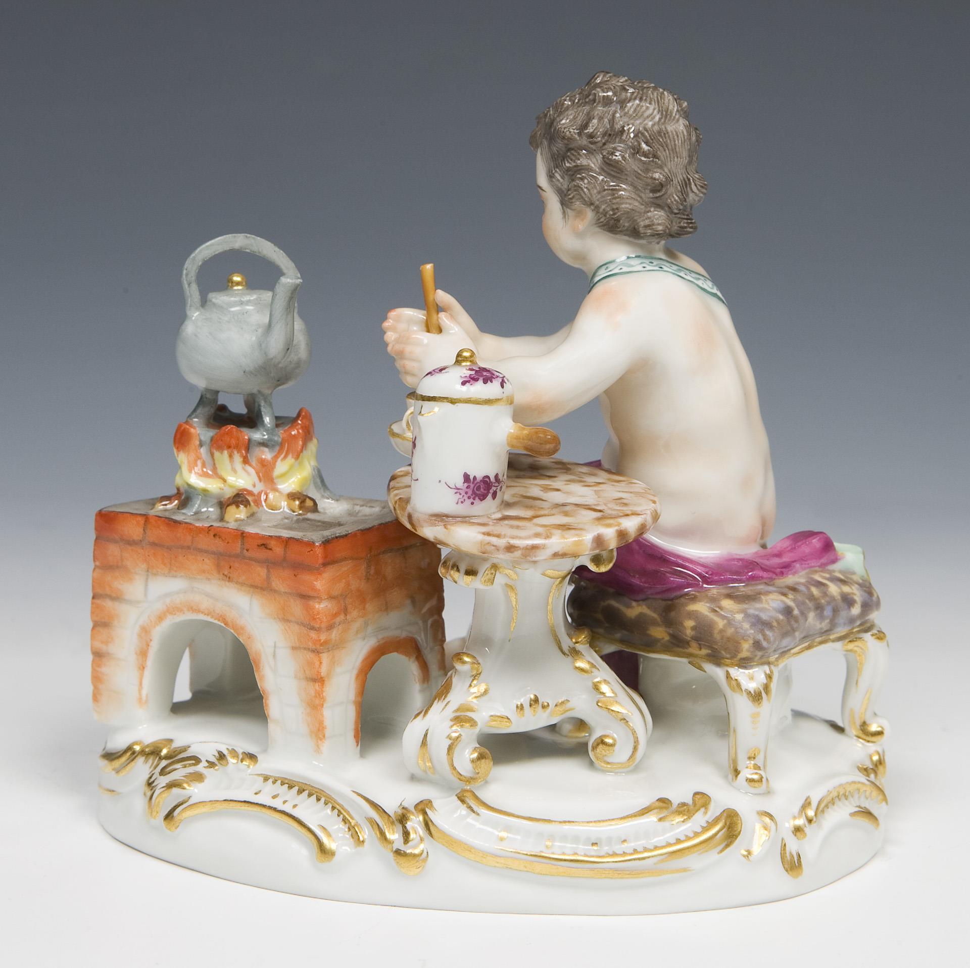 Modell-Jahr: 1770, aus einer Serie "Die 4 Elemente", farbig bemalt, gold staffiert. Ritzmarke, Pressmarke, Malermarke, Schwertermarke.
