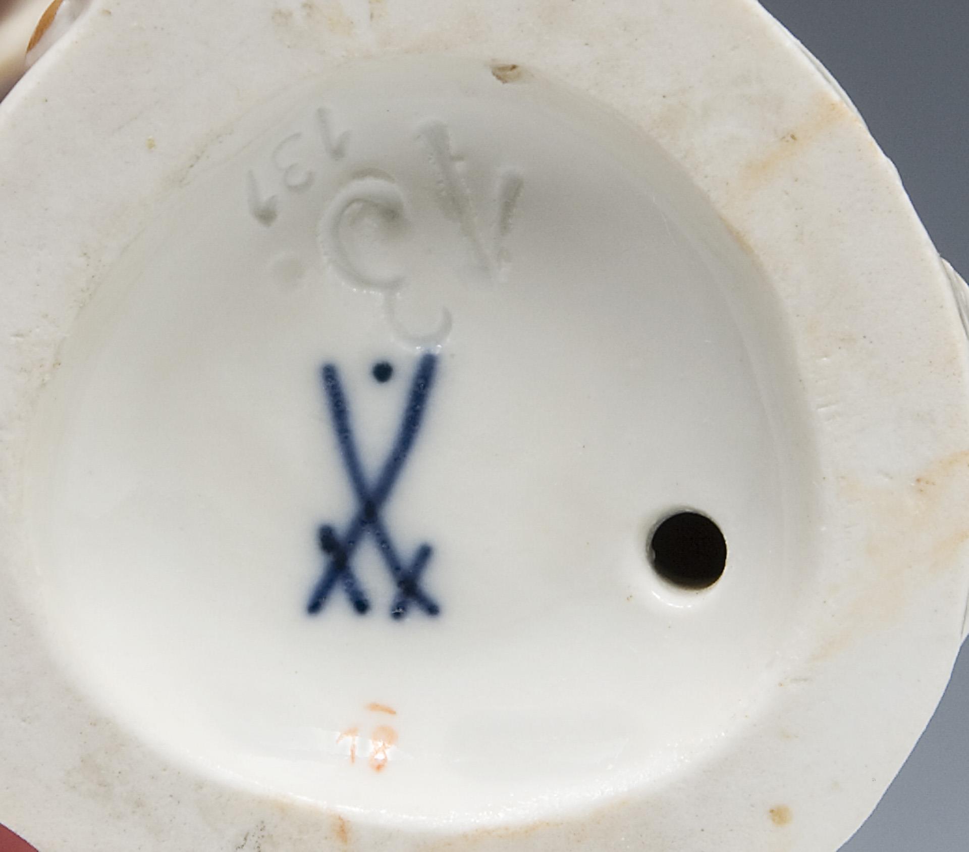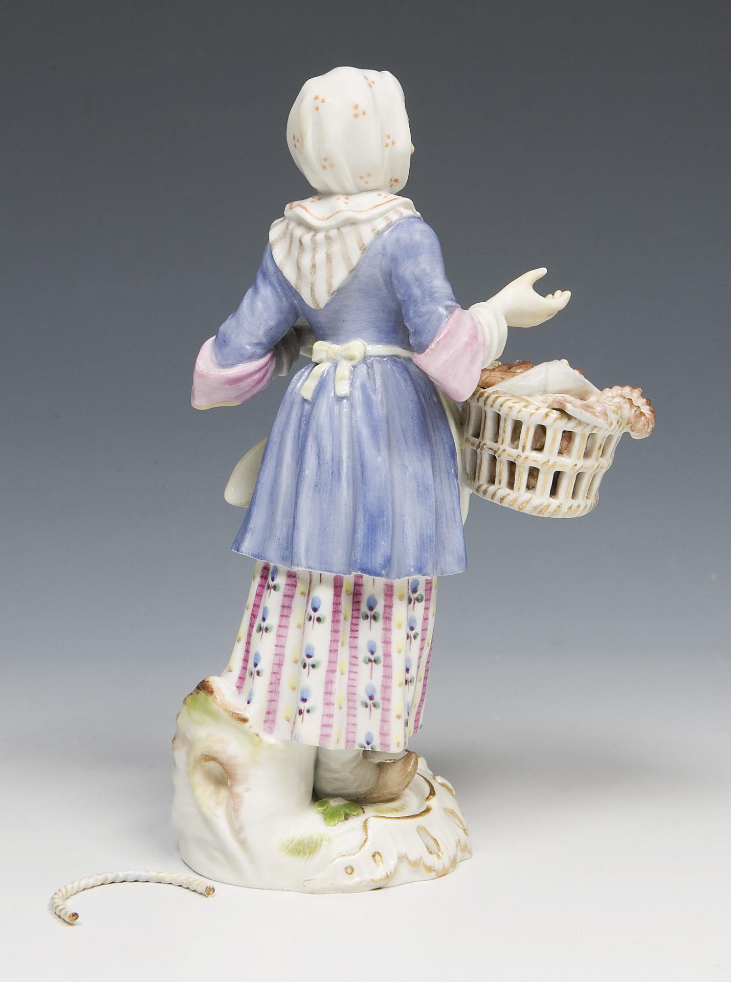 Modell-Jahr: 1753-1754, aus einer Serie von 34 Figuren, farbig bemalt, gold staffiert. Ritzmarke, Pressmarke, Malermarke, Schwertermarke mit Punkt. Ein Gebäck, eine Brezel bestoßen, eine Hand, eine Brezel restauriert, Henkel lose vorhanden.