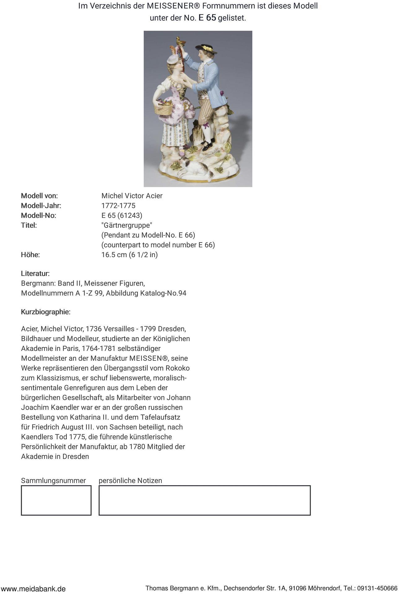 Acier, Bildhauer und Modelleur, studierte an der Akademie in Paris, 1764-1781 selbständiger Modellmeister in Meissen. Meissen-Manufaktur-Preis: 6490,- Euro * Partnerauktion Bergmann.