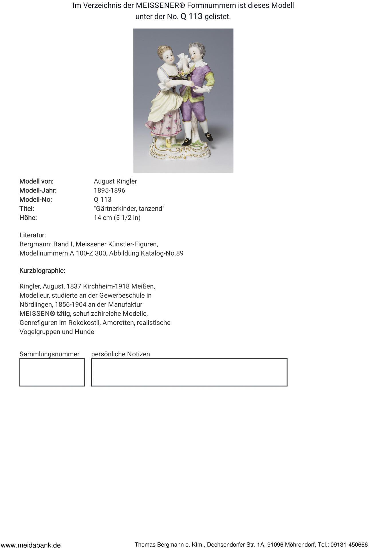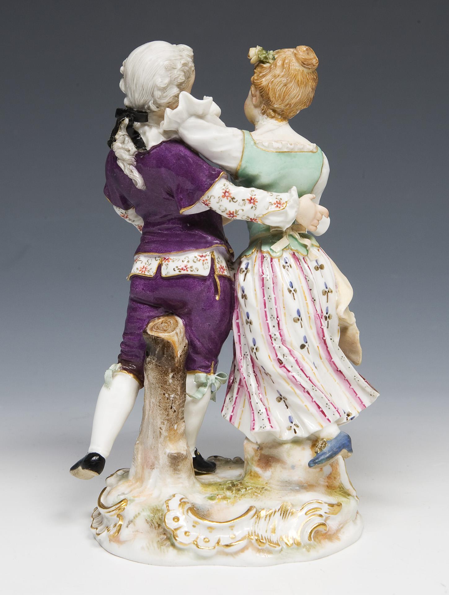 Modell-Jahr: 1895-1896, "Gärtnerkinder, tanzend", farbig bemalt, gold staffiert. Ritzmarke, Pressmarke, Malermarke, Schwertermarke. Mädchen-Nacken-Kopf-Bruchstelle, drei Schuhe, Schleifen, eine Tuchecke, ein Knie sichtbar alt restauriert, eine Blüte im Haar bestoßen.