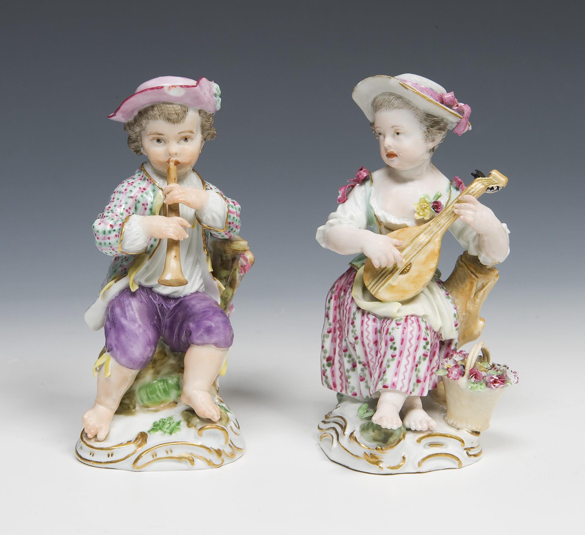 Meissen-Modelle von Joachim Kaendler 1750-1760, "Knabe mit Oboe", "Mädchen mit Laute", farbig bemalt, gold staffiert. Unglasierter Boden, Pressmarke, undeutliche Blaumarke am Sockel. Mädchen: Sockel von unten, Hutkrempe, Schleifen, Blüten, Lautenwirbel bestoßen, Knabe: Korb fehlt, Hutkrempe, Schleifen, Oboe bestoßen.