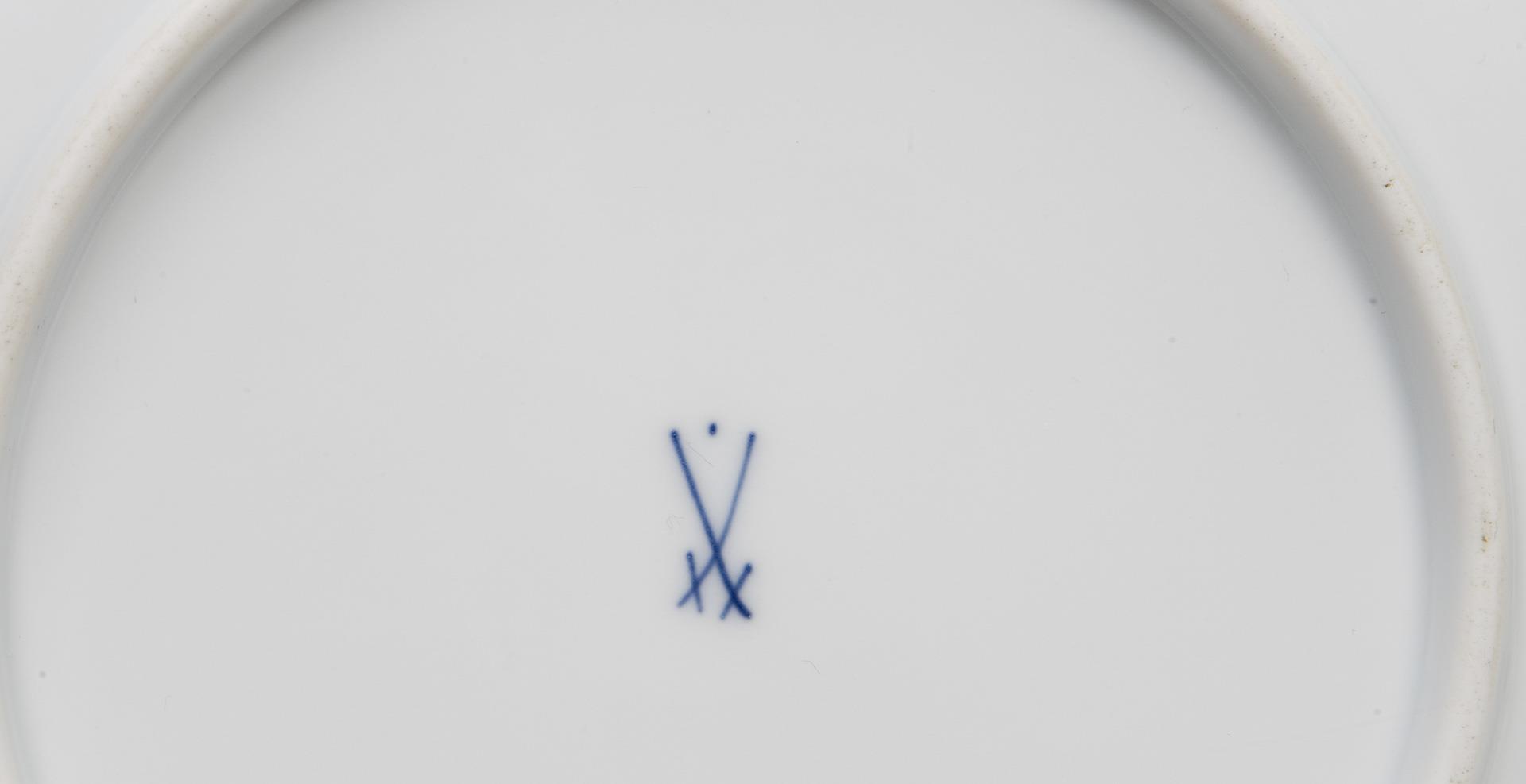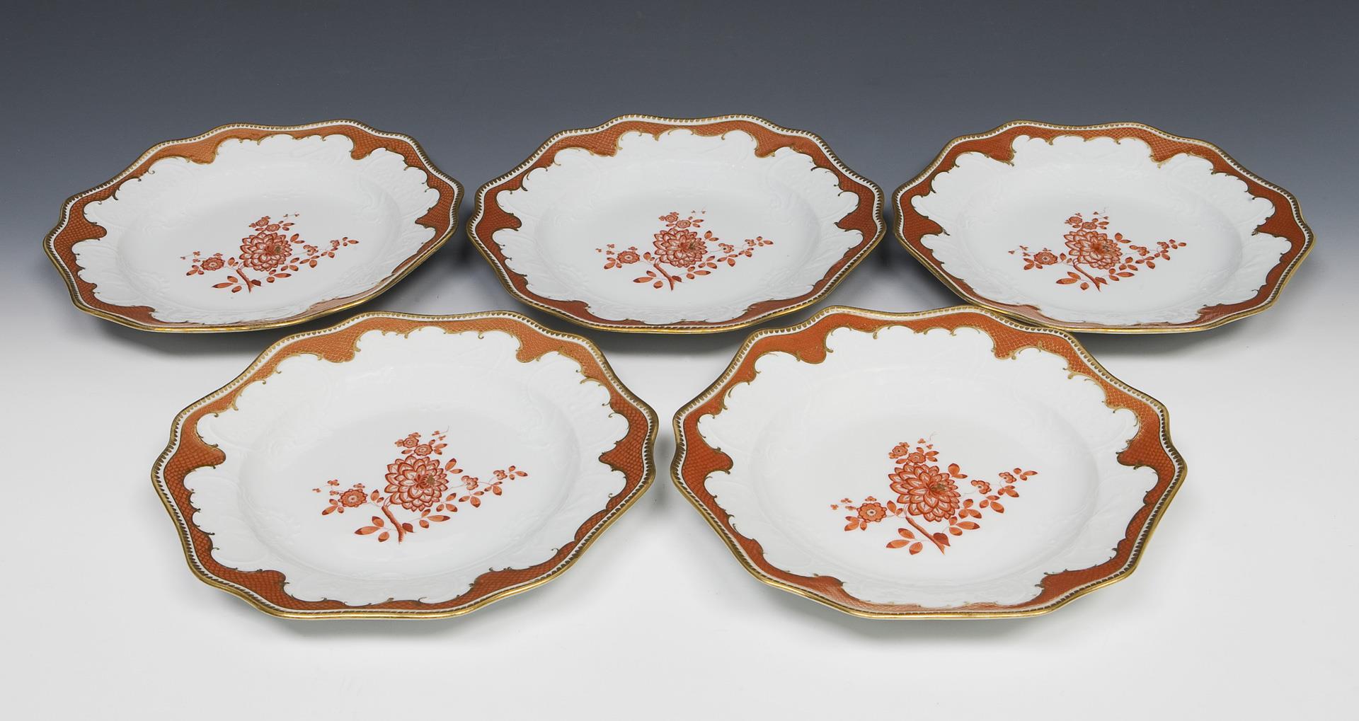 Reliefierte Rocaillen-Kartuschen mit Symbolen der Wissenschaft, der Kunst und des militärischen Triumphes im Wechsel mit Blütenzweigen. Bemalung in Eisenrot und Gold mit Schuppenrand, Zahnkante und indianischen Blütenzweigen. Pressmarken, Schwertermarken mit Punkt, ein Teller 1935-1947.