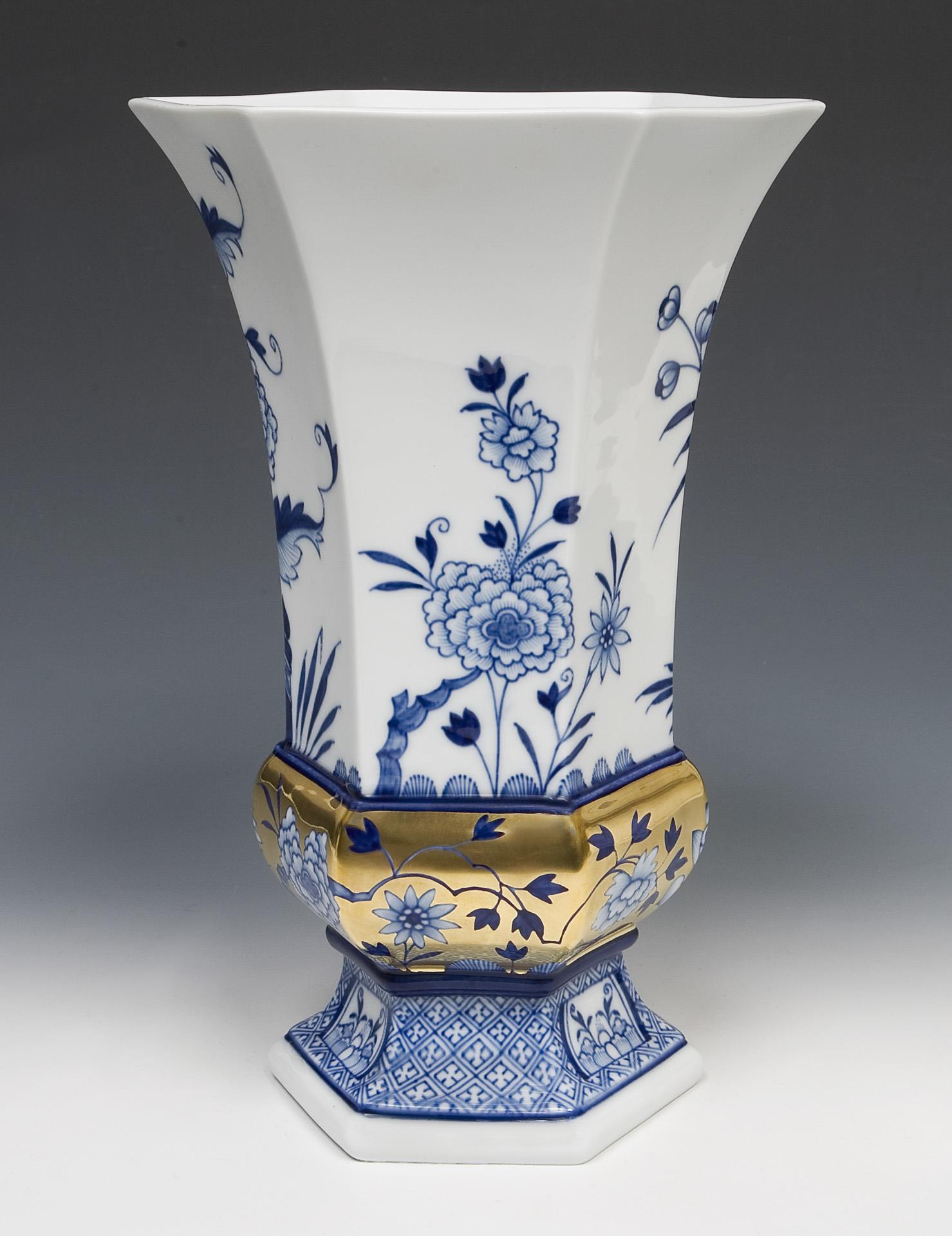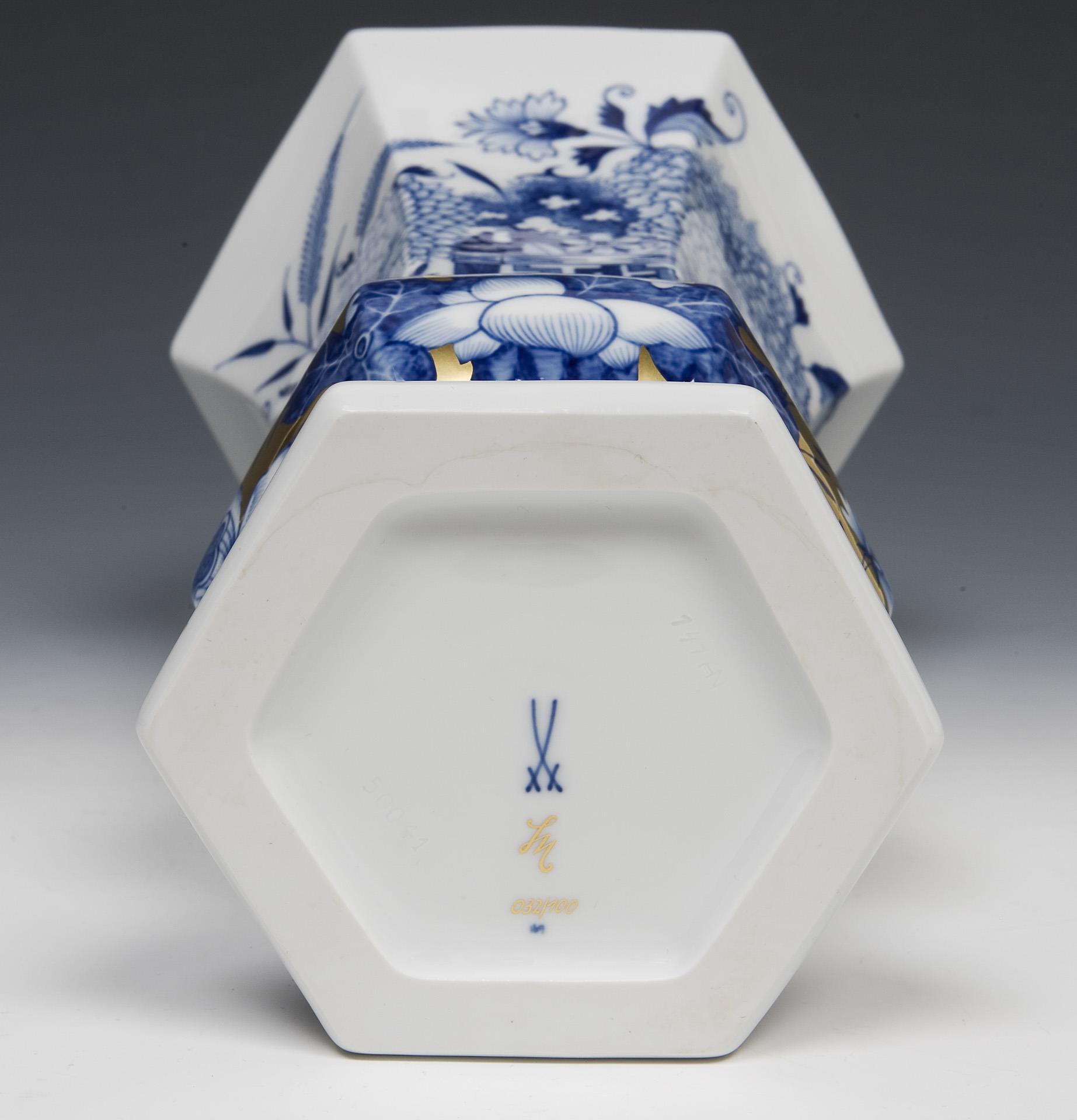 Limited Edition, nummeriertes Exemplar 32/100. Dekor-Nr. 204990, umlaufend kobaltblaue Unterglasurmalerei, Dekor "Zaun mit indianischen Blumen" und Rautenbordüre, partiell Goldfond, sechseckiger Korpus. Pressmarke, Malermarke, Schwertermarke, goldenes Sondersignet.