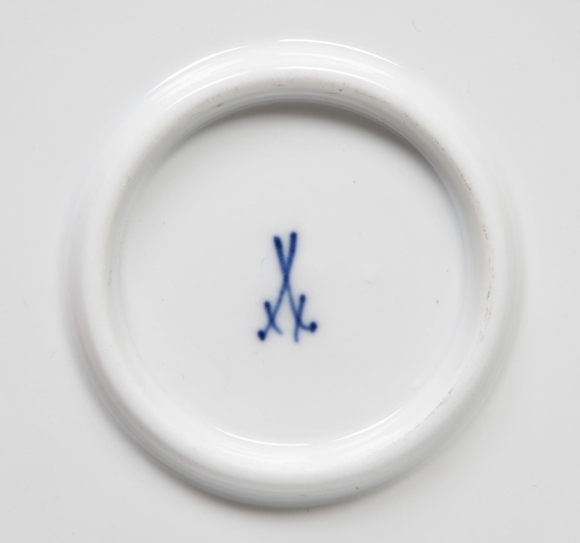 Geometrisch durchbrochen gearbeitet in vierfachem Rapport. Impressionistisch angelegte farbige florale Bemalung, glatter, gold staffierter Rand mit vier Einkerbungen. Pressmarken, Schwertermarken.