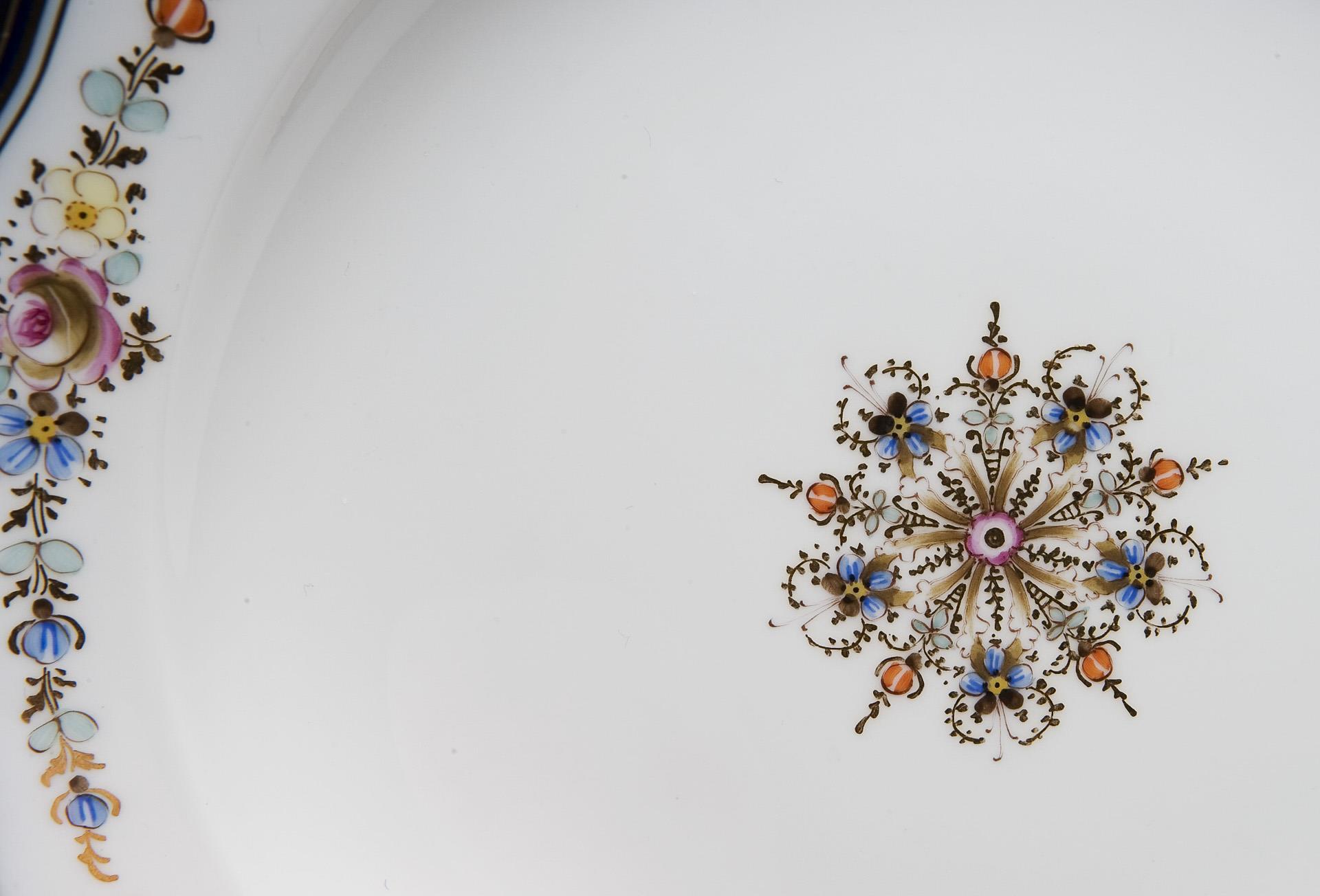Form "Neuer Ausschnitt", farbig bemalt, gold staffiert, kobaltblaue Ränder. Florale Bemalung mit farbigen Blüten und Blattranken in Gold. Dessertteller mit filigranen Rosetten im Spiegel. 23 Teile: Kaffeekanne, Milchkanne, Zuckerdose, 6 Tassen, 6 Untertassen, 6 Dessertteller, 2 Eierbecher. Schwertermarken, Kaffeekanne 1924-1934, eine Schwertermarke mit Punkt. Eine Rose minimal bestoßen, ein Deckelrand partiell, eine Rose restauriert.
