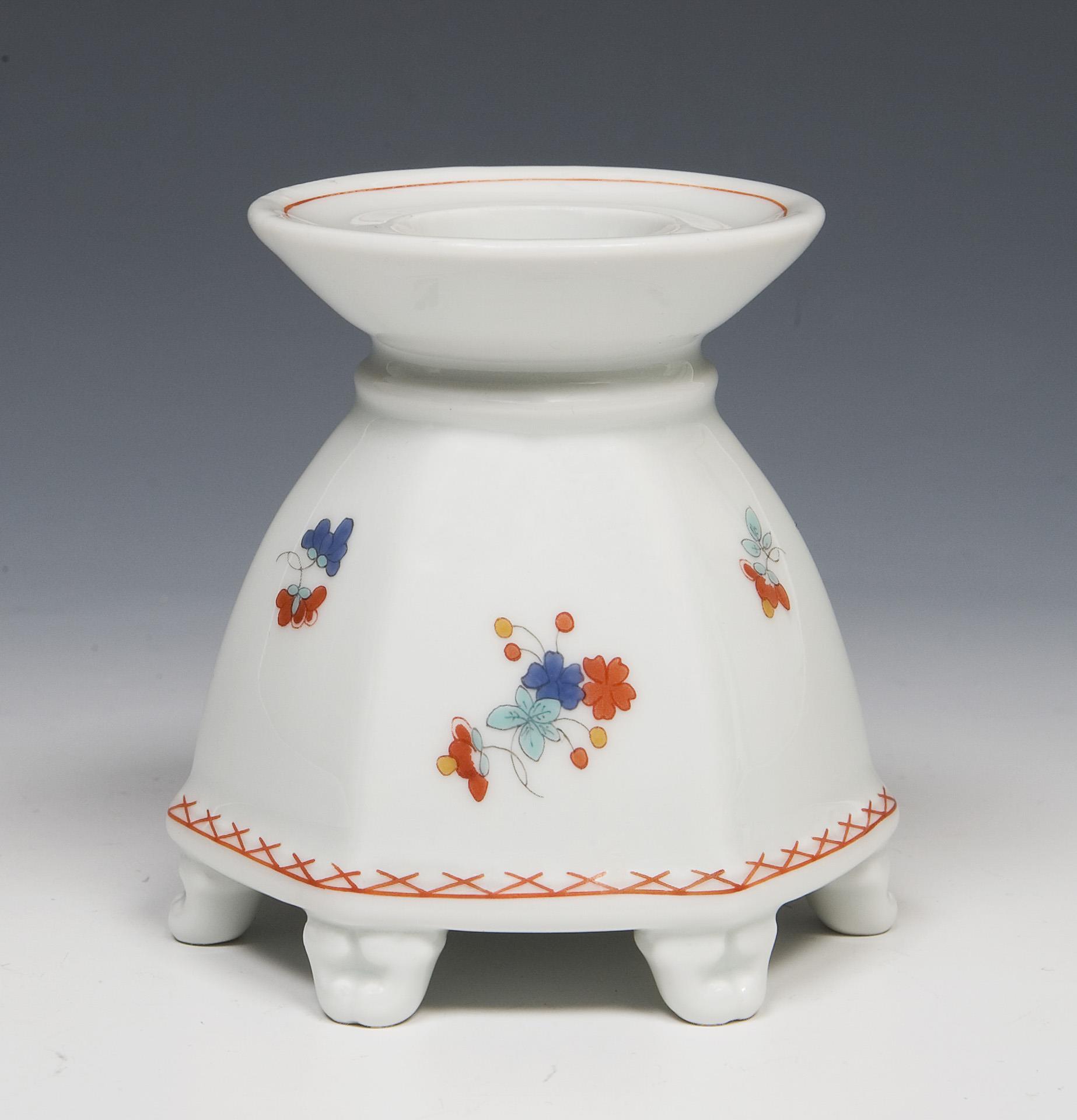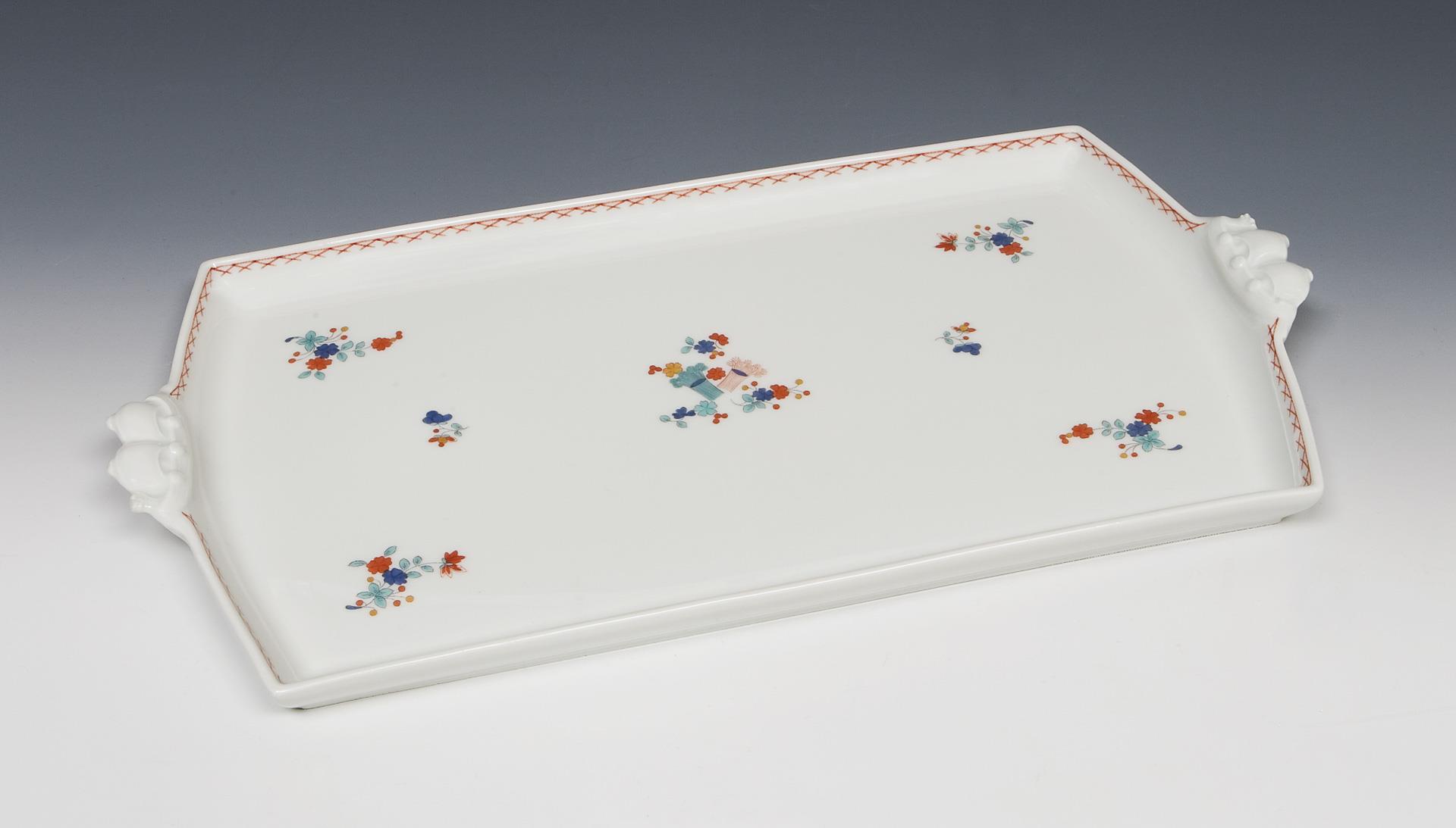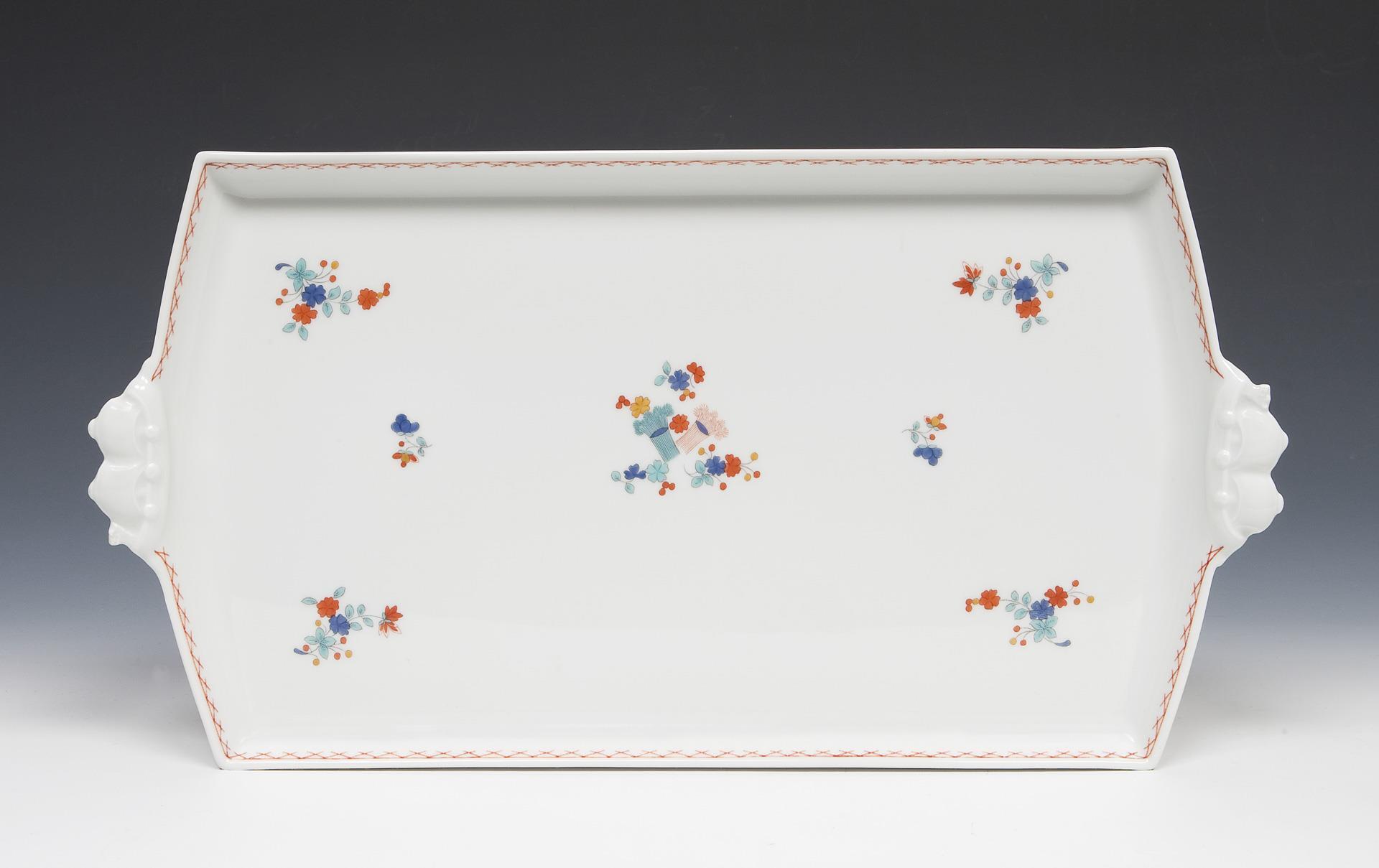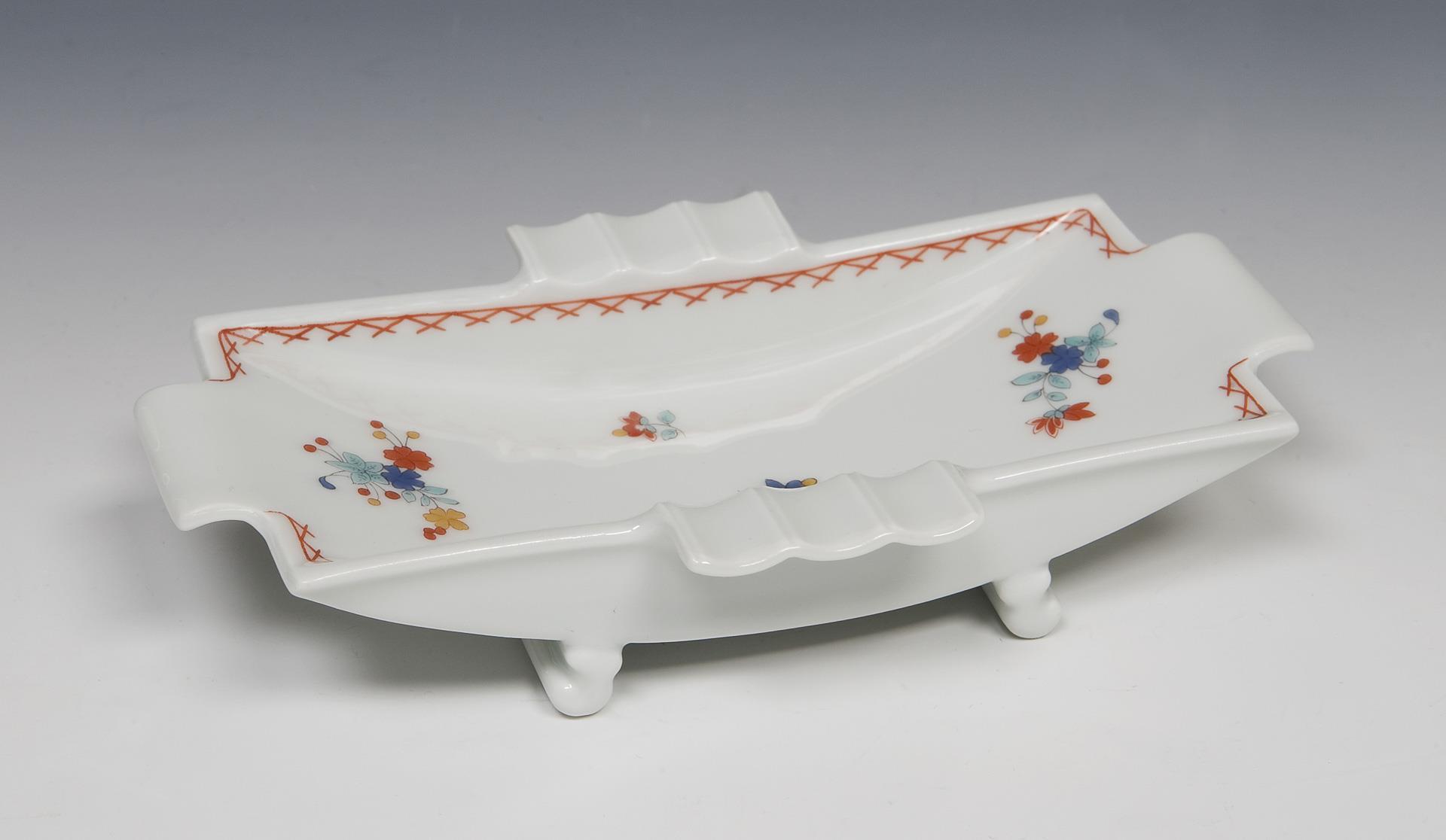 Modell-Jahr: 1940. 4 Teile: Tablett, Zigarettendose, Aschenbecher, Kerzenleuchter. Farbige Bemalung mit indianischen Blüten und Ornamentbordüren. Tablett mit unglasiertem Boden, Pressmarken, Malermarken, Schwertermarken. Eine minimale Ecke der Tablett-Handhabe restauriert.