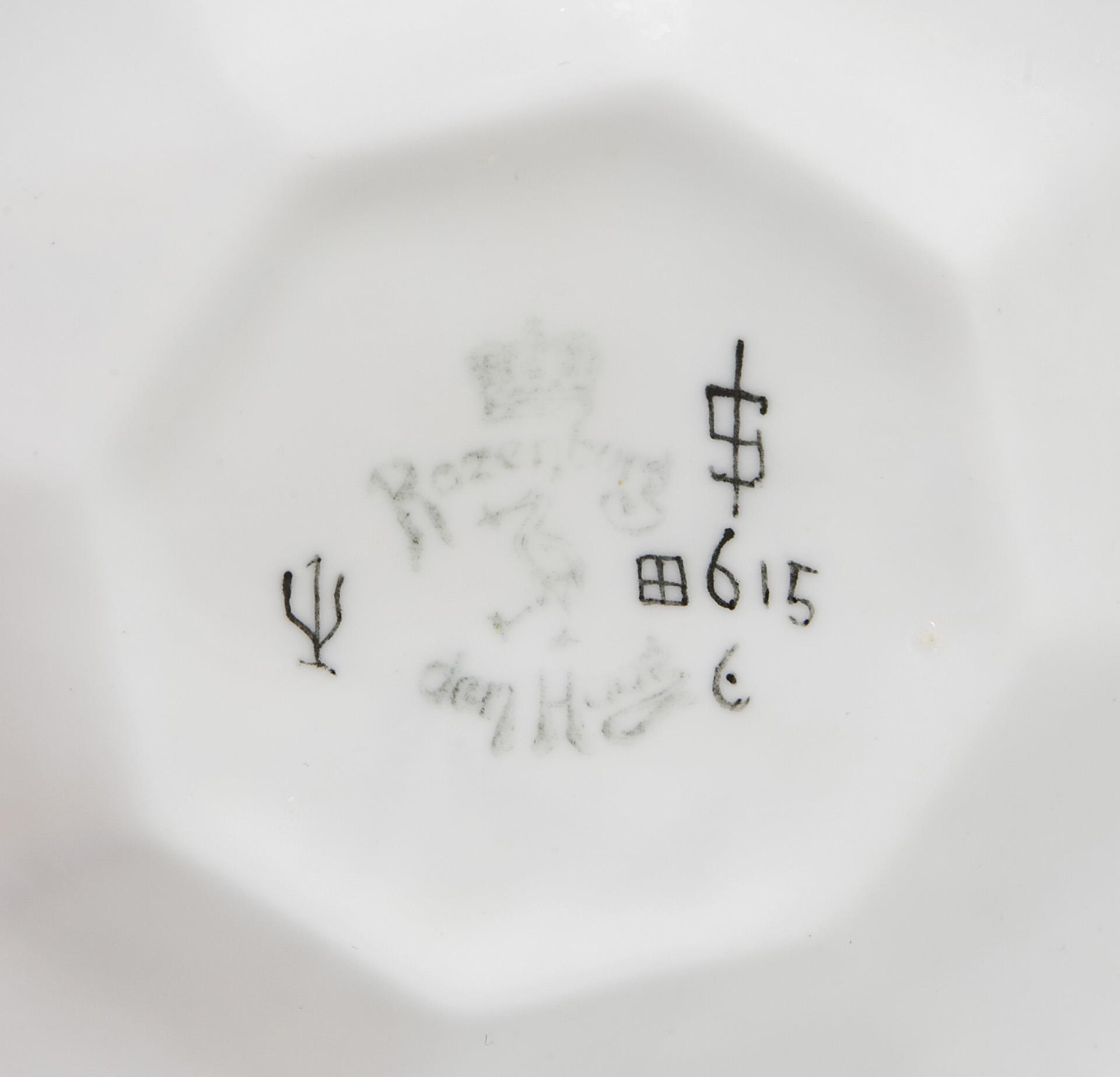 Hauchdünnes, sogenanntes Eierschalen-Porzellan. Farbige Bemalung von Samuel Schellinck "Blumen- und Vogeldekor", 8-eckige Form. Grüne Bodenmarke mit Storch, Malersignatur und Auftragsnummer 615, Jahreszeichen in Schwarz.
