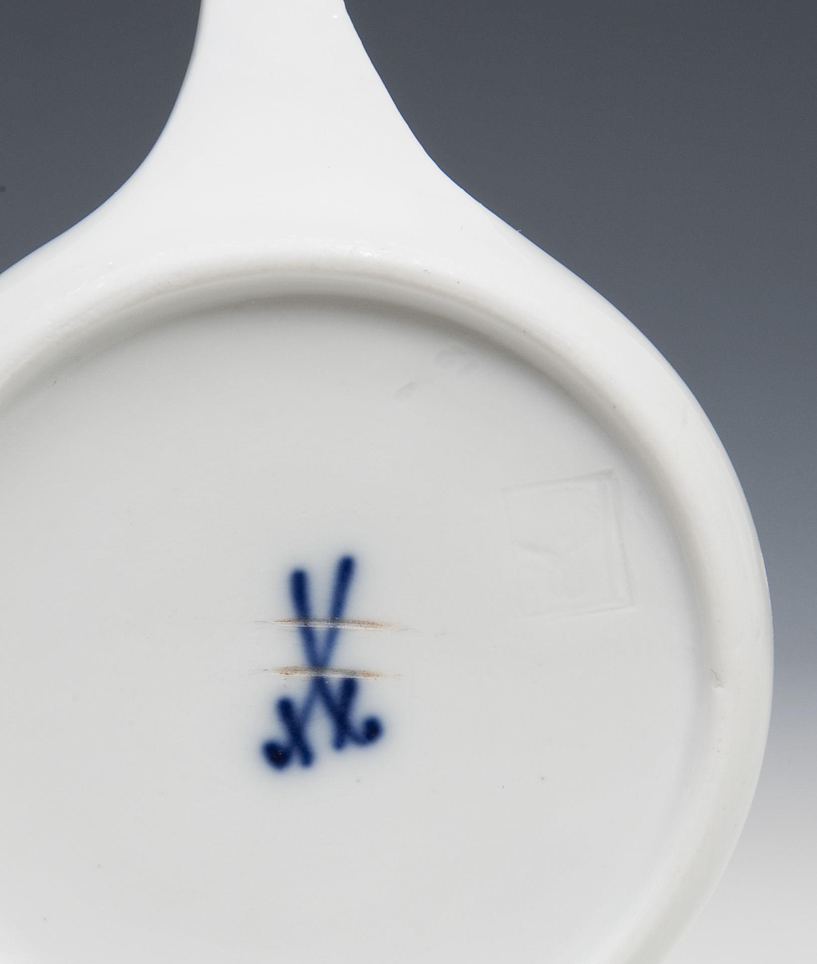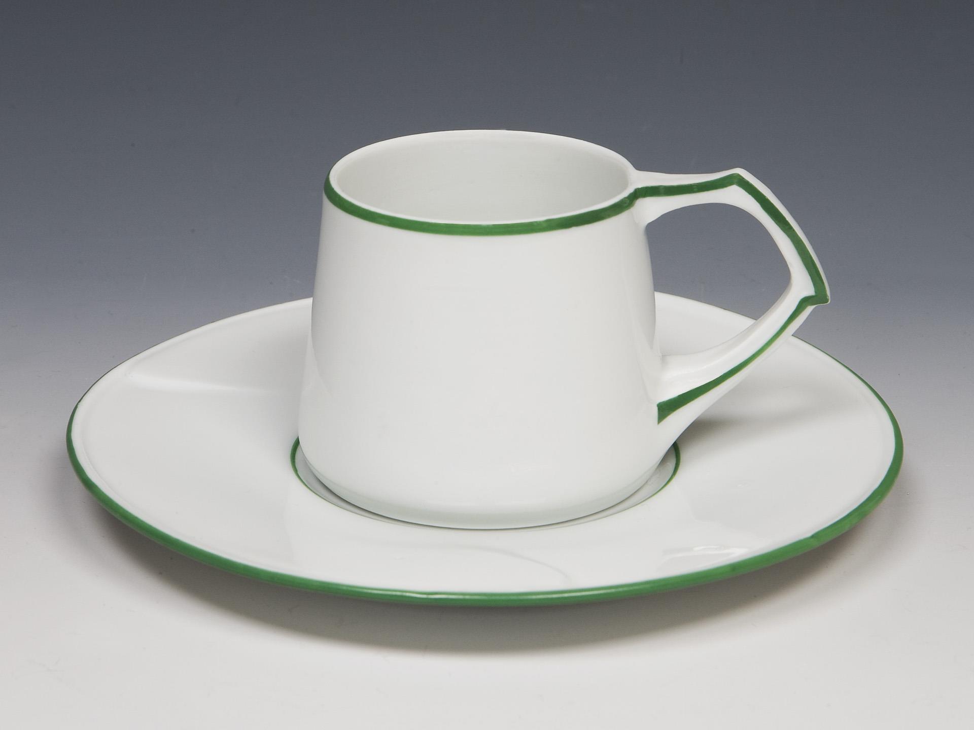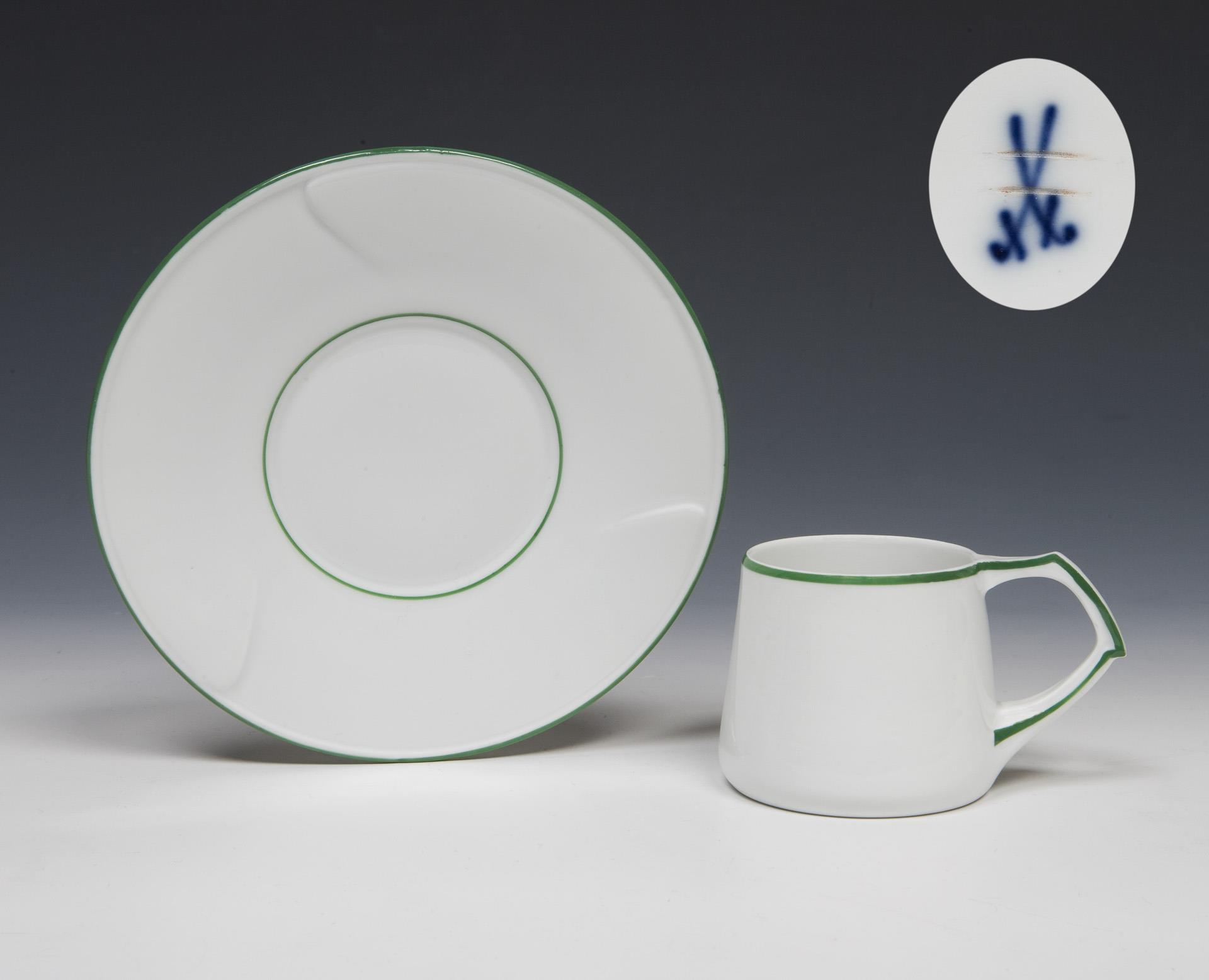 Modell-Jahr: 1903, grün staffiert, Untertasse mit reliefierten Wellenlinien, sogenannter "Peitschenhieb". Pressmarken, Schwertermarken, auf Tasse und Untertasse Künstler-Signet.