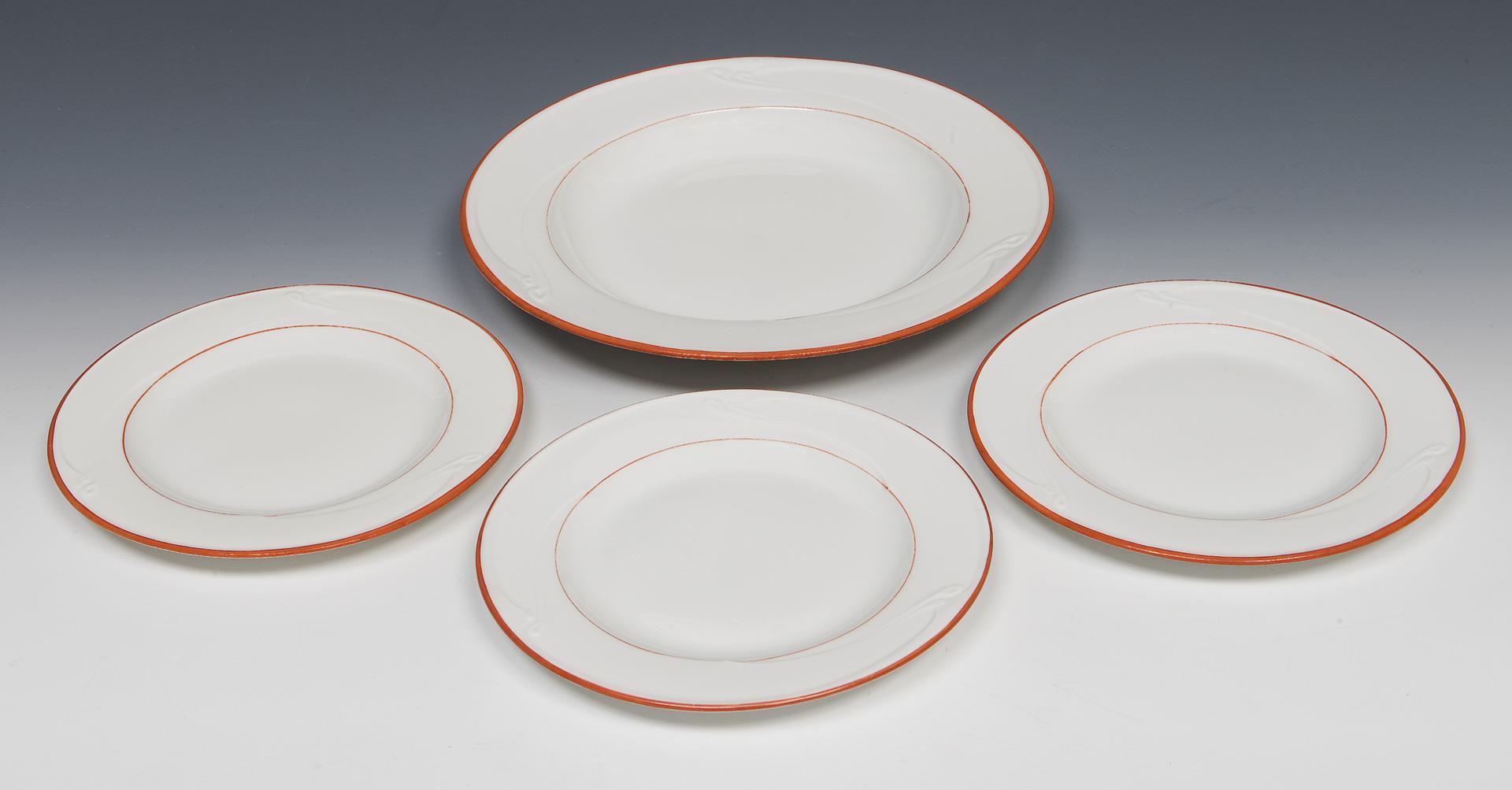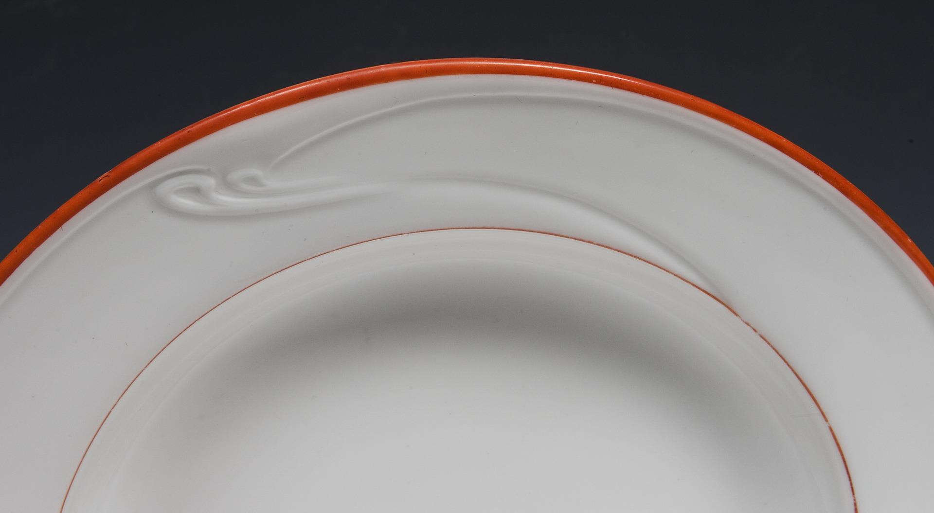 Modell-Jahr: 1903, korallenrot staffiert, reliefierte Wellenlinien, sogenannter "Peitschenhieb", Pressmarken, Schwertermarken viermal gestrichen, jeder Teller mit Künstler-Signet.