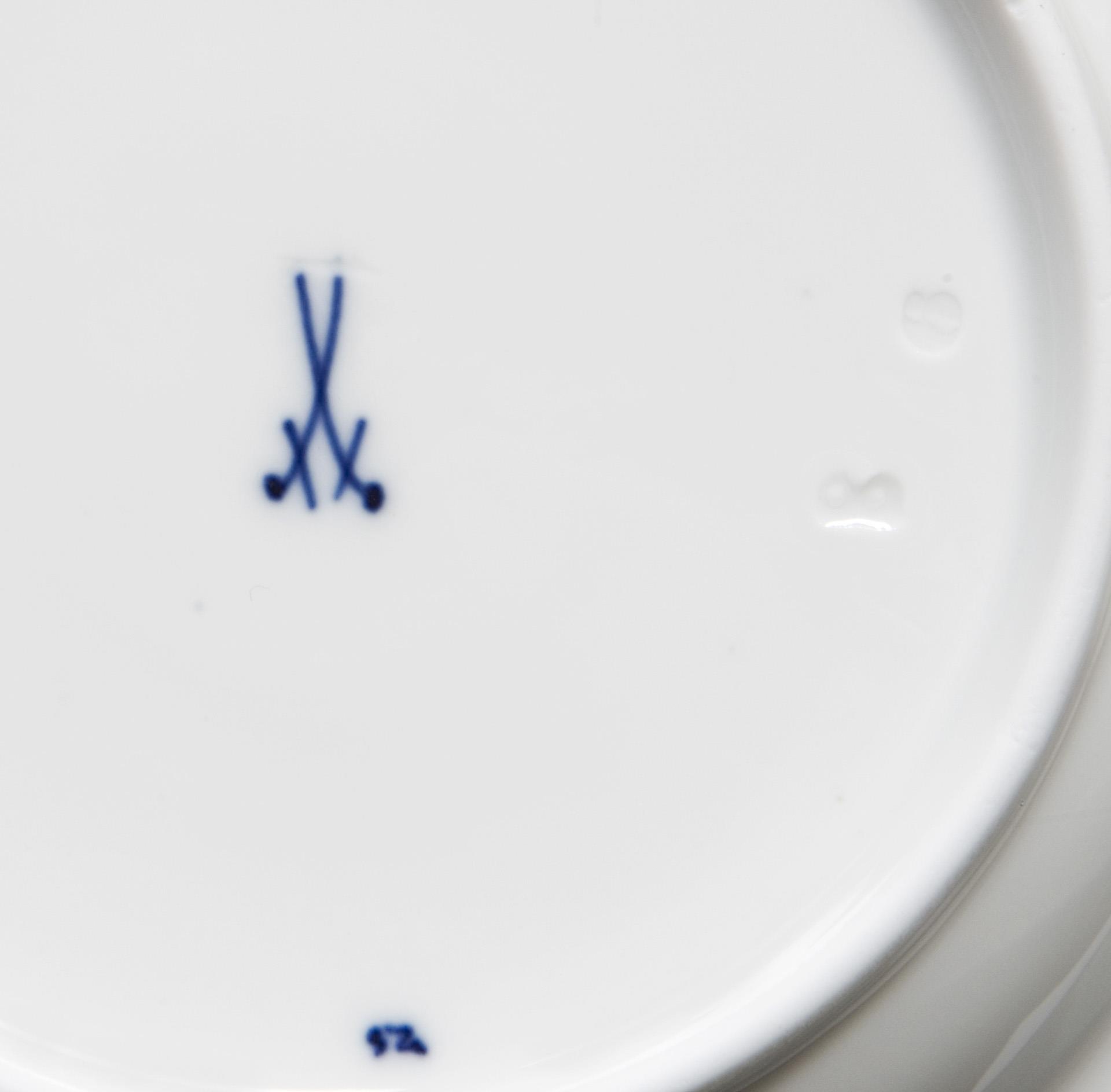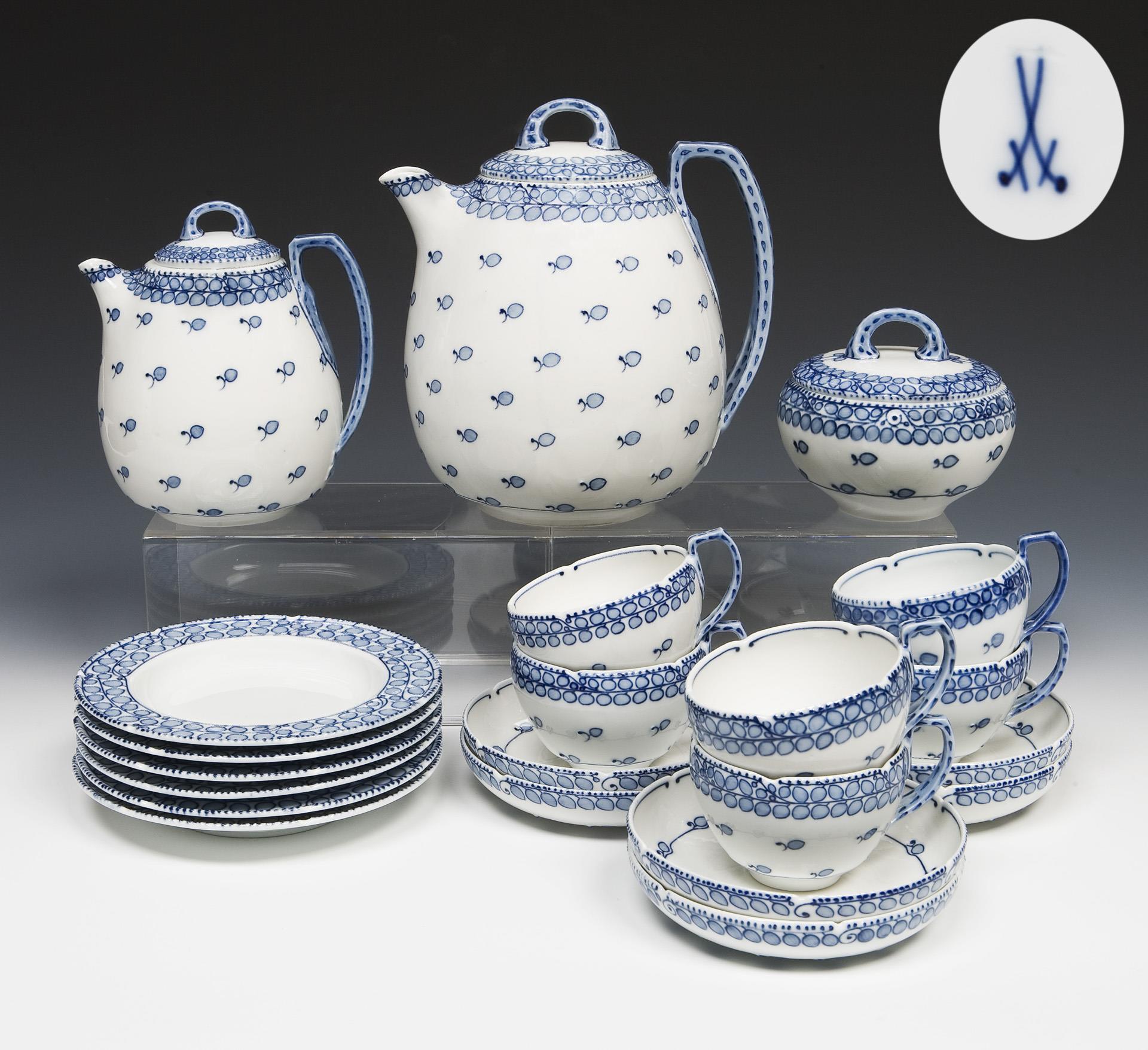 Modell-Jahr: 1904, kobaltblaue Unterglasurbemalung, reliefierte Perlränder. 21 Teile: Kaffeekanne, Milchkanne, Zuckerdose, 6 Tassen, 6 Untertassen, 6 Dessertteller. Pressmarken, Malermarken, Schwertermarken, Kaffeekanne zweimal gestrichen, Dose, eine Untertasse 1935-1947. Doseninnenrand, ein Untertassenrand leicht bestoßen.