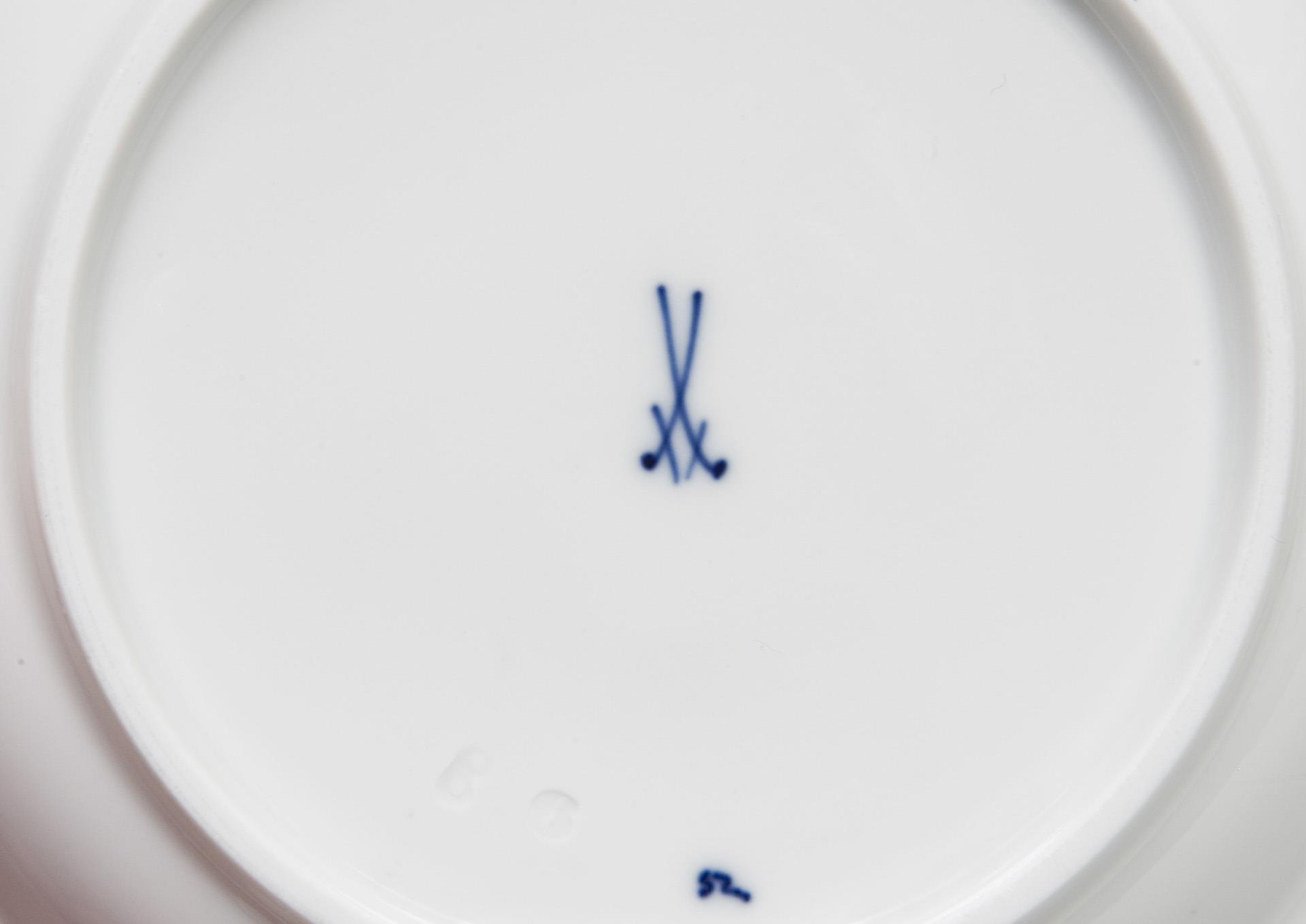 Modell-Jahr: 1904, kobaltblaue Unterglasurbemalung, reliefierte Perlränder. 21 Teile: Kaffeekanne, Milchkanne, Zuckerdose, 6 Tassen, 6 Untertassen, 6 Dessertteller. Pressmarken, Malermarken, Schwertermarken, Dose nach 1935.