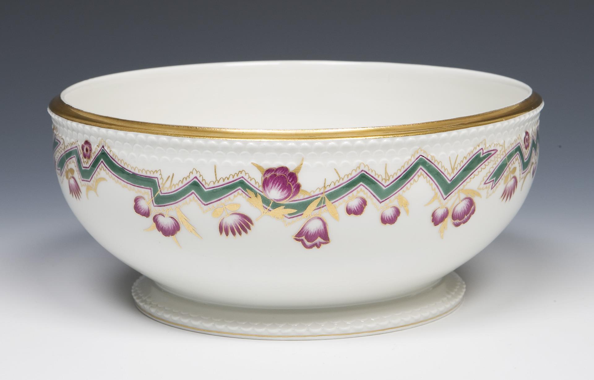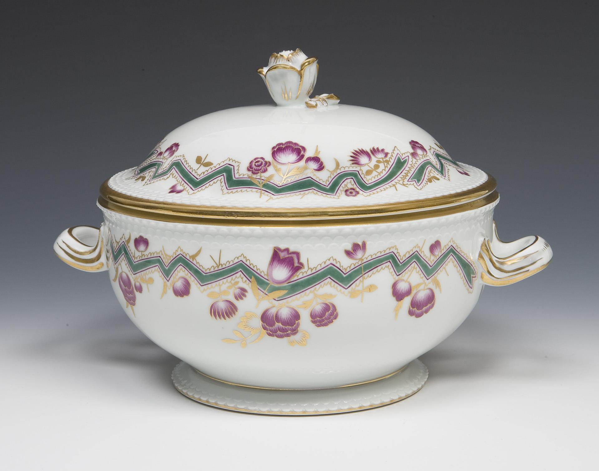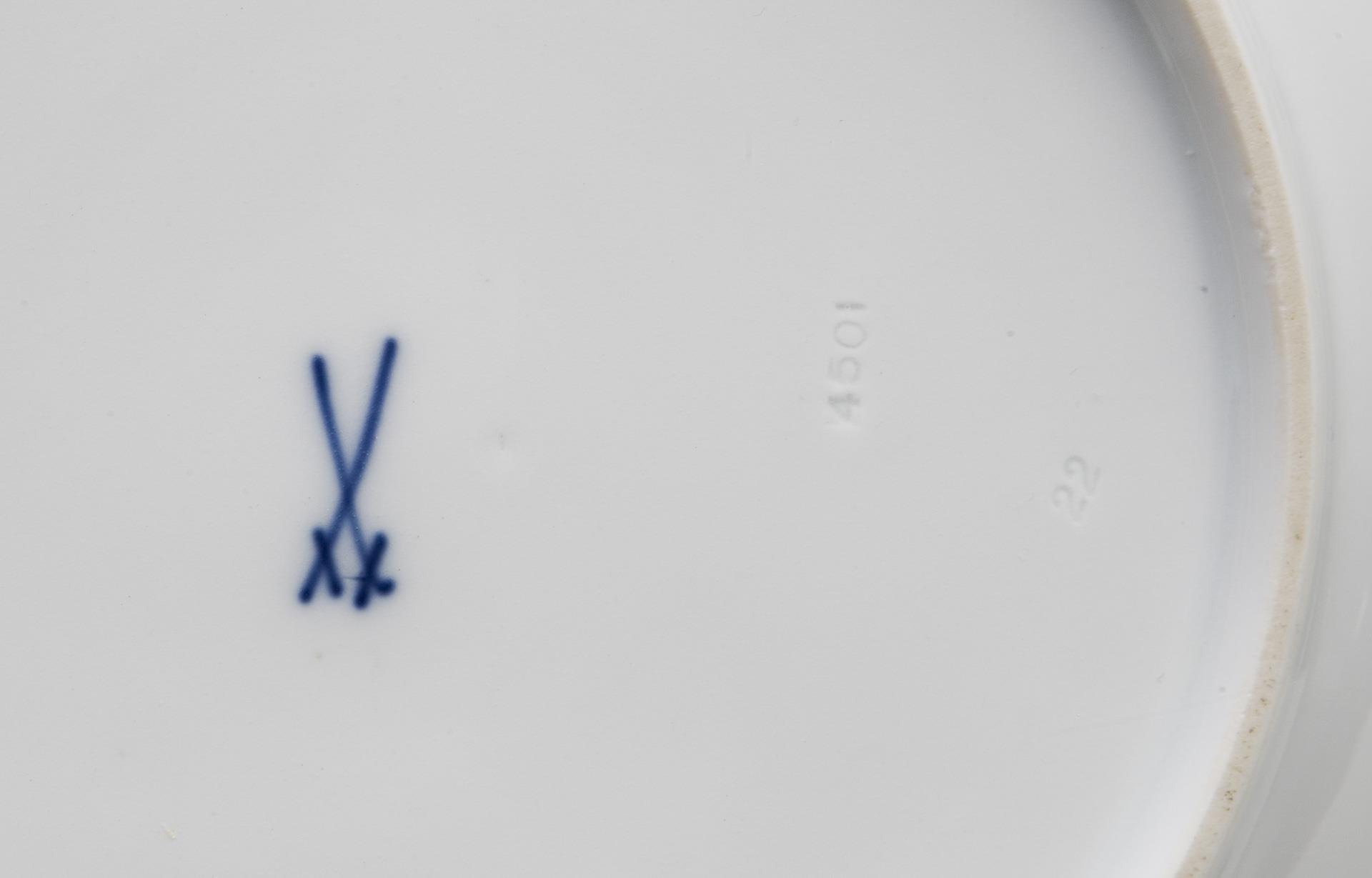 Modell-Jahr: 1920, reliefierte Schuppenränder, ornamentale und florale Bemalung in Grün, Purpur und Gold, Goldstaffage. 23 Teile: 1 Terrine, 1 Schüssel, 1 Platte, 1 Sauciere, 1 Salzschale, 9 Essteller, 9 Suppenteller. Pressmarken, Schwertermarken. Partiell kleine Glasurdefekte, ein Tellerstandring minimal bestoßen.