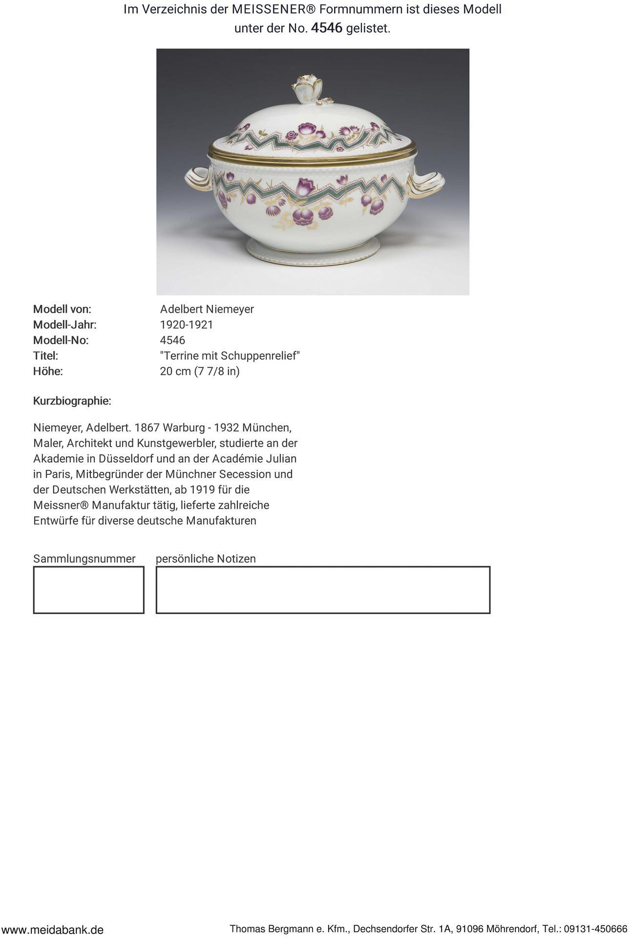 Niemeyer, Maler, Architekt und Kunstgewerbler, studierte an den Akademien in Düsseldorf und Paris. Mitbegründer des Deutschen Werkbundes und der Deutschen Werkstätten, lieferte zahlreiche Entwürfe für diverse deutsche Manufakturen * Partnerauktion Bergmann.