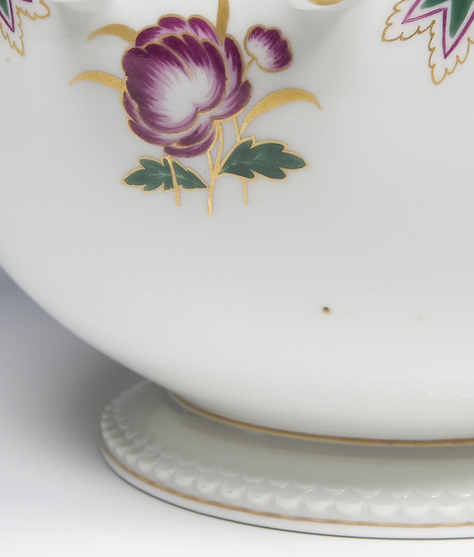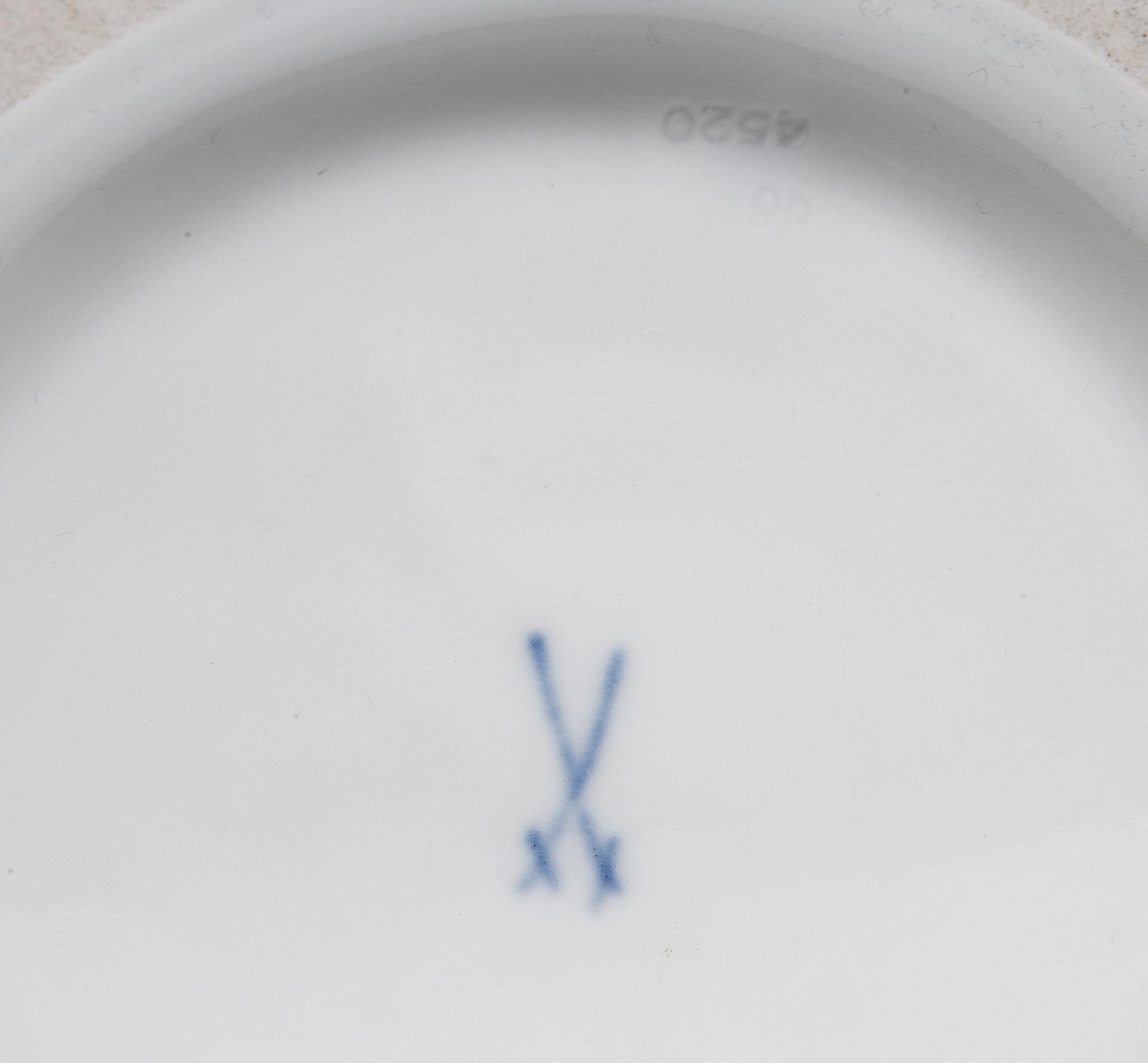 Modell-Jahr: 1920, reliefierte Schuppenränder, ornamentale und florale Bemalung in Grün, Purpur und Gold, Goldstaffage. Pressmarken, Schwertermarke. Partiell kleine Glasurdefekte.