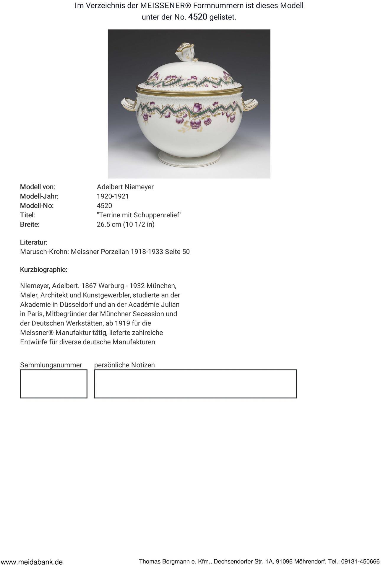 Niemeyer, Maler, Architekt und Kunstgewerbler, studierte an den Akademien in Düsseldorf und Paris. Mitbegründer des Deutschen Werkbundes und der Deutschen Werkstätten, lieferte zahlreiche Entwürfe für diverse deutsche Manufakturen * Partnerauktion Bergmann.