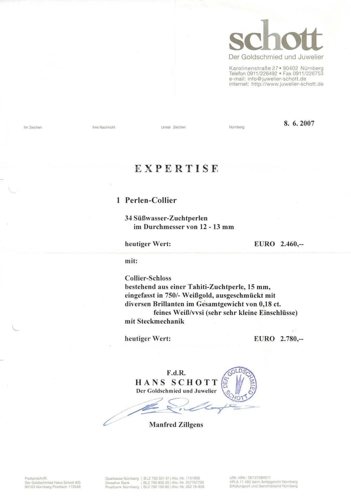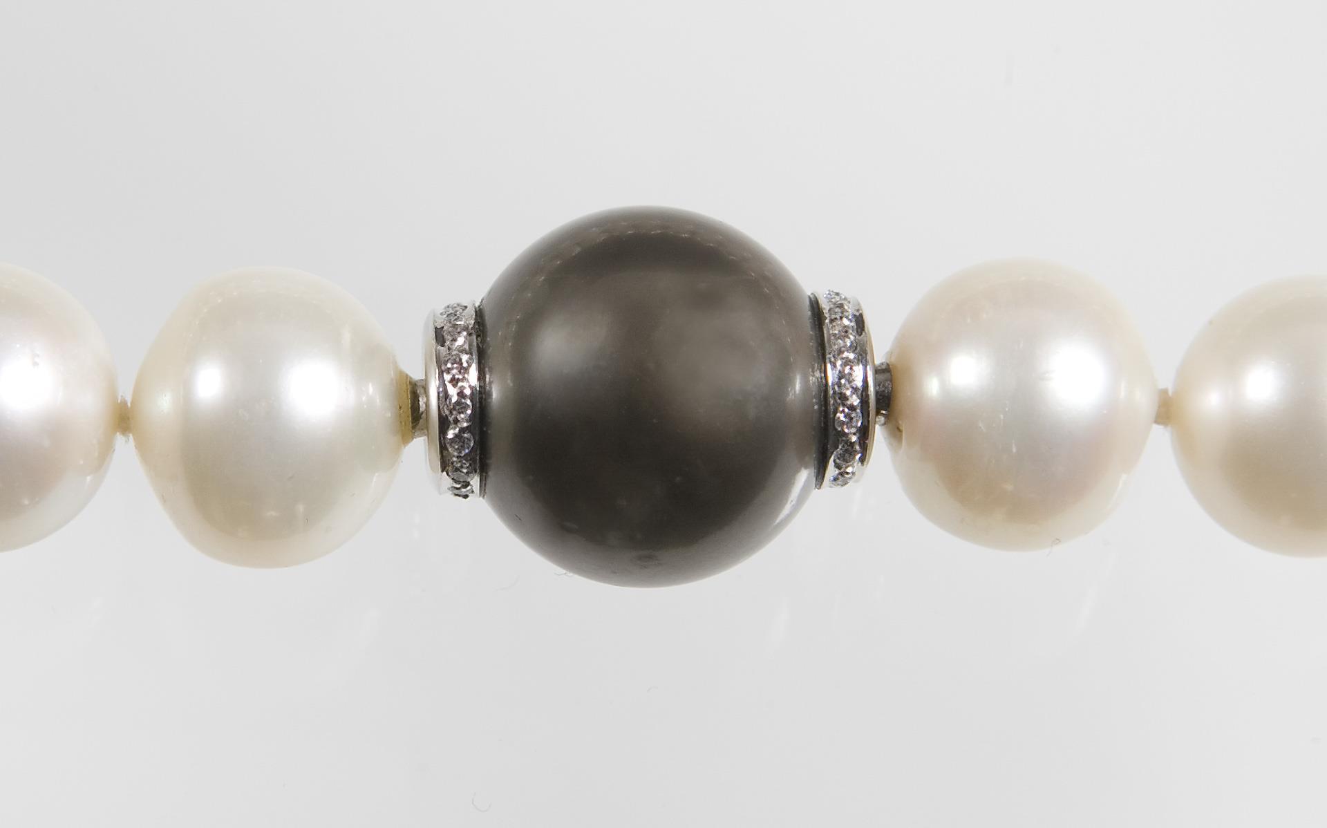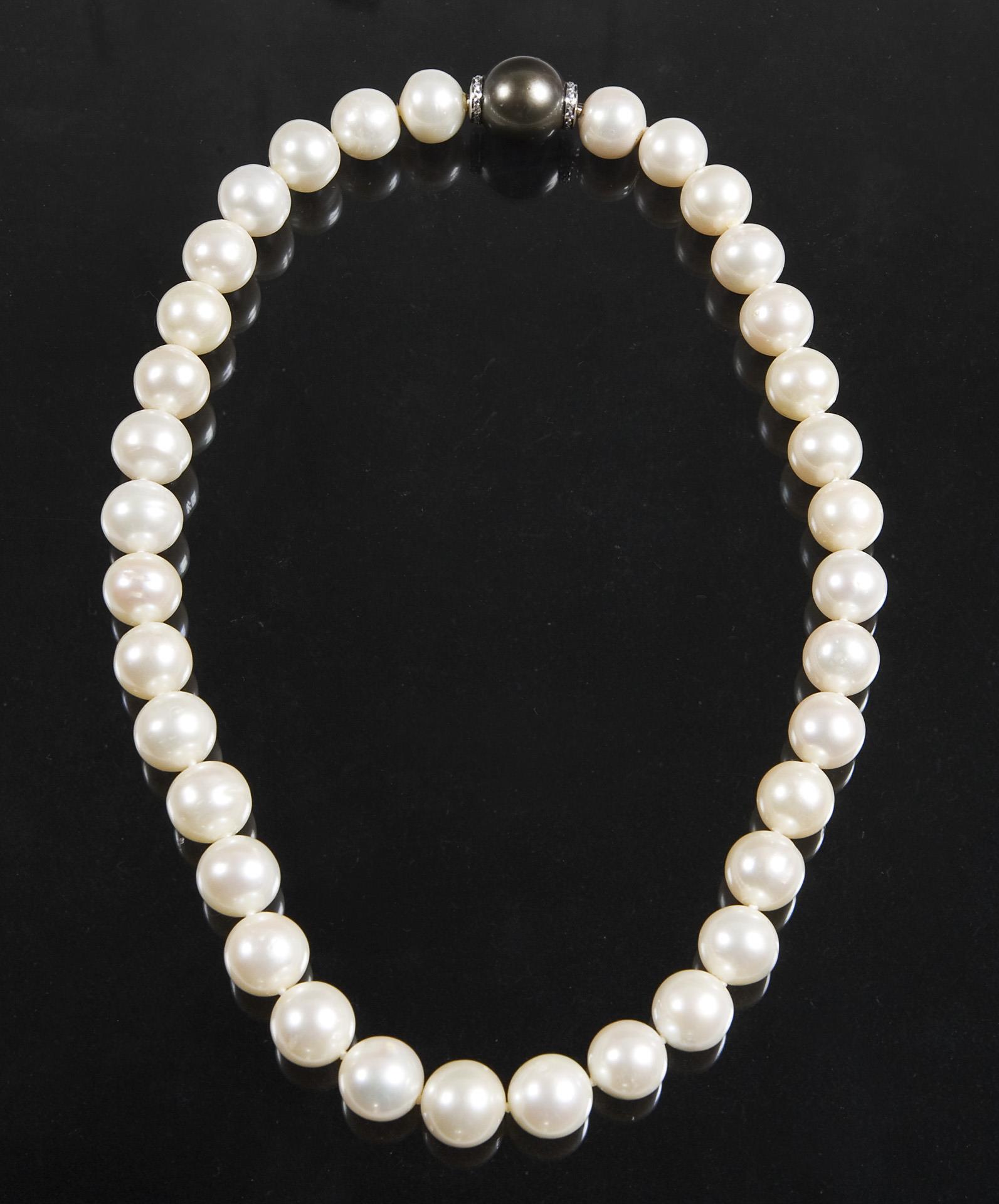 34 Süßwasser-Zuchtperlen ø 12-13 mm. Bajonett-Schließe mit Tahiti-Zuchtperle ø 15 mm, eingefasst in 750er Weißgold (18 kt) mit kleinen Brillanten 0,18 ct, feines Weiß, vvsi (sehr sehr kleine Einschlüsse). Mit Expertise vom 08.06.2007, Wert: 2780,- Euro.