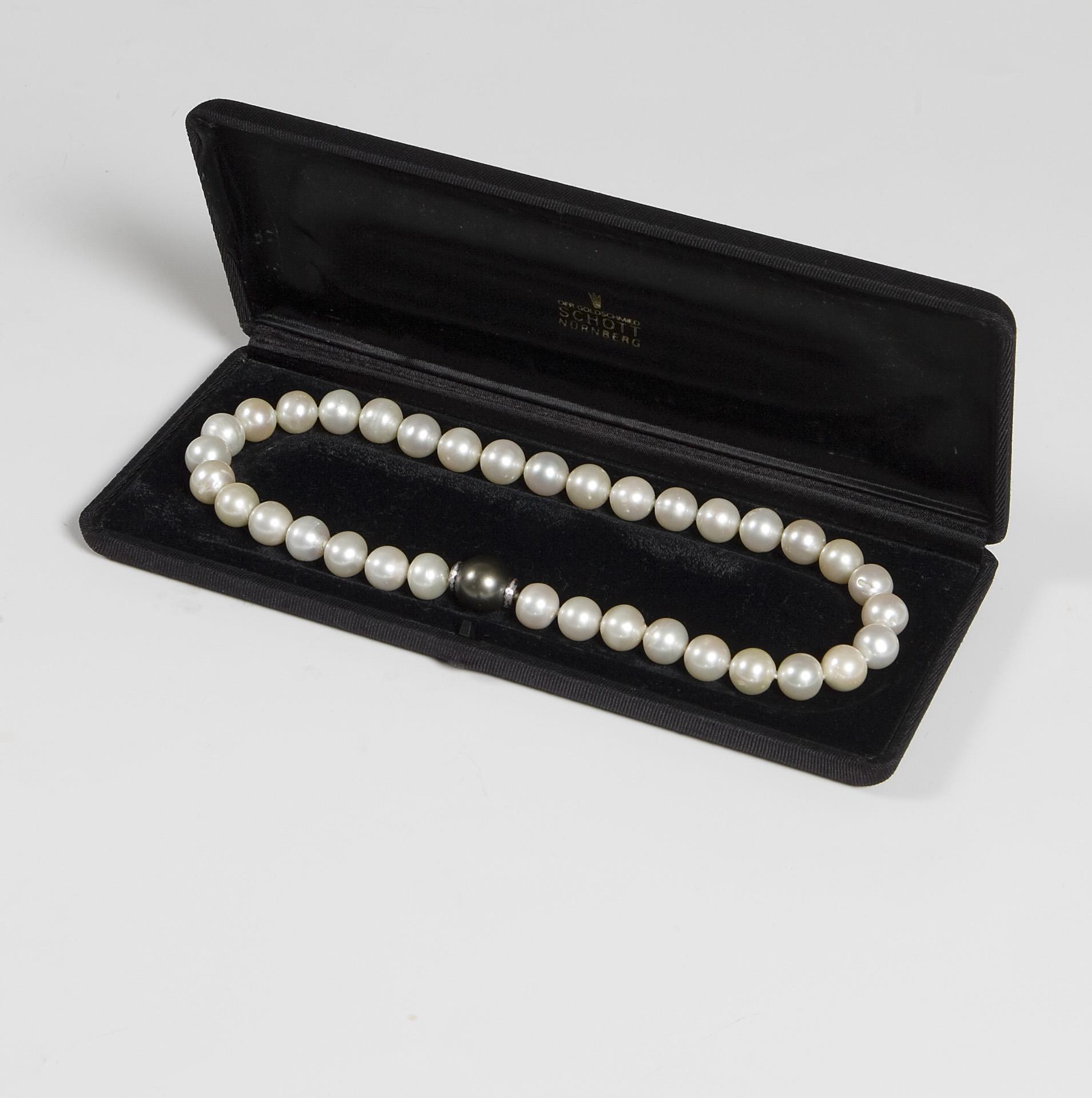 Perlen-Collier im Original-Etui. Juwelier Schott, Nürnberg.