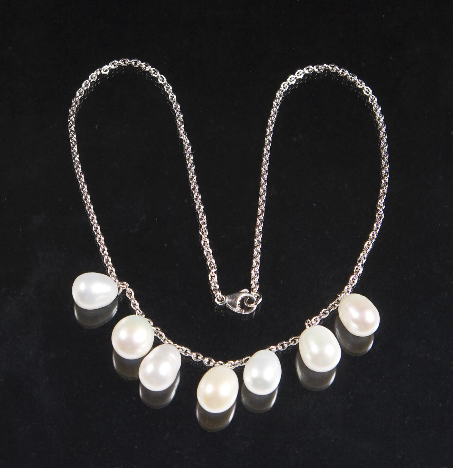 7 ovale Süßwasser-Zuchtperlen mit gutem Lüster circa 11-12 mm. Kette mit Karabiner, Punzen: Feingehalt.