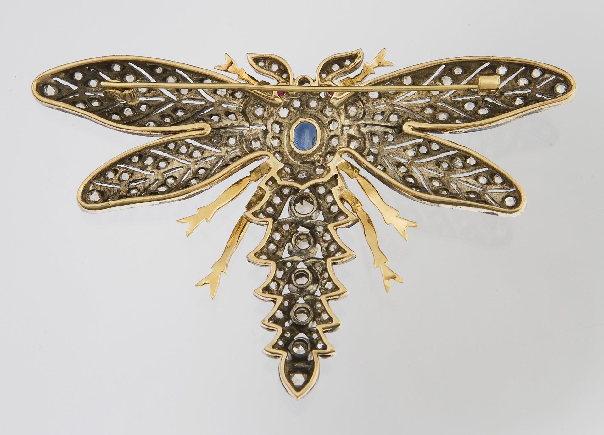 Zahlreiche Diamanten circa 3,7 ct, 1 facettierter Saphir in Zargenfassung circa 1,8 ct, 2 kleine Rubin-Cabochons. Punzen: Kokoschnik-Marke mit Feingehalt.