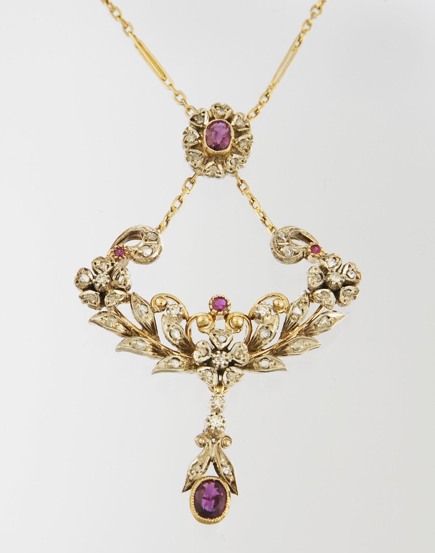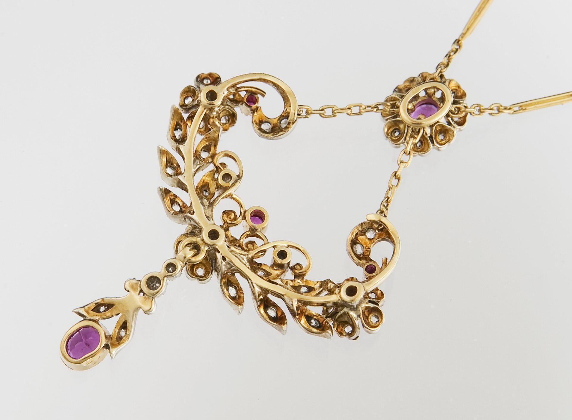 5 Rubine, zahlreiche kleine Diamanten in Silber-Fassungen, floral durchbrochen gearbeitet, grazile Kette, Kastenschließe mit Öse. Zwei undeutliche Goldpunzen.