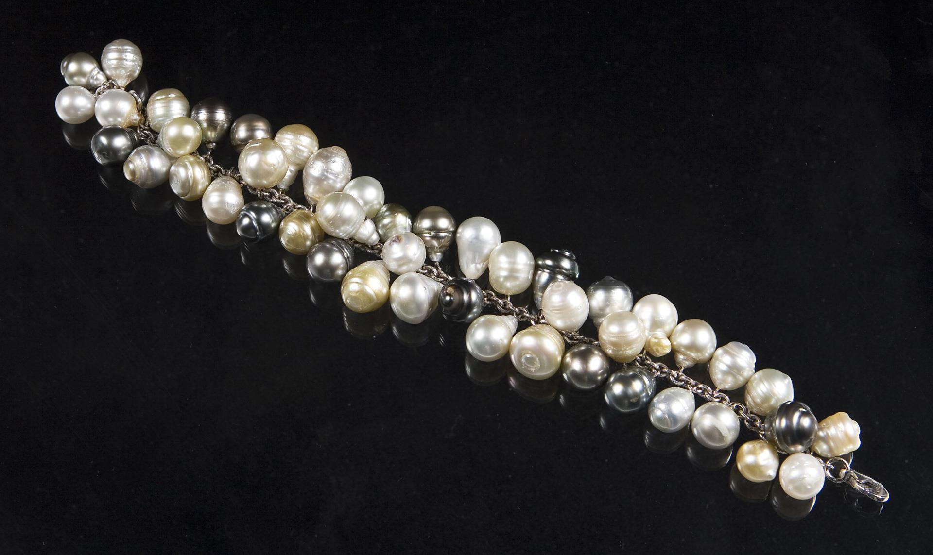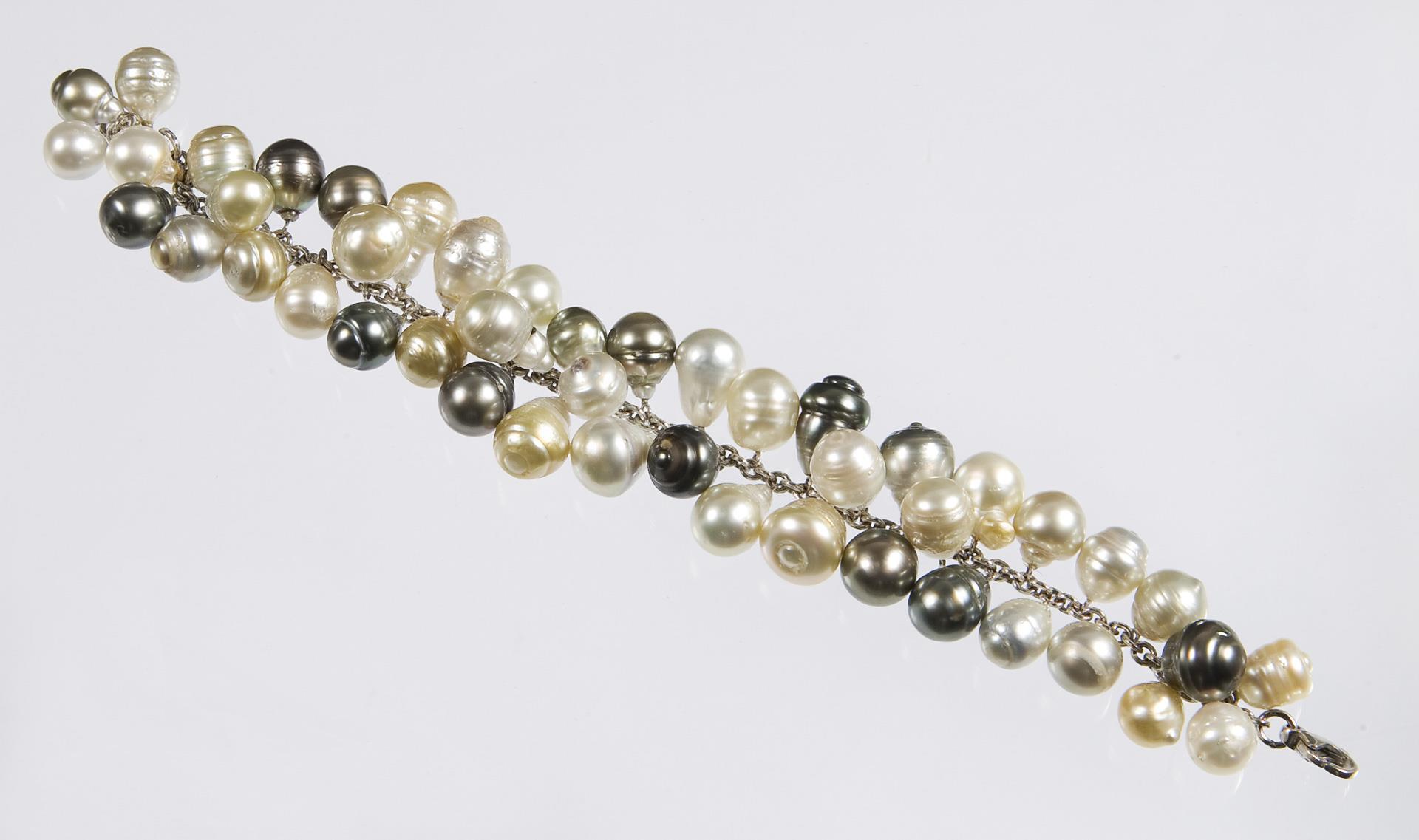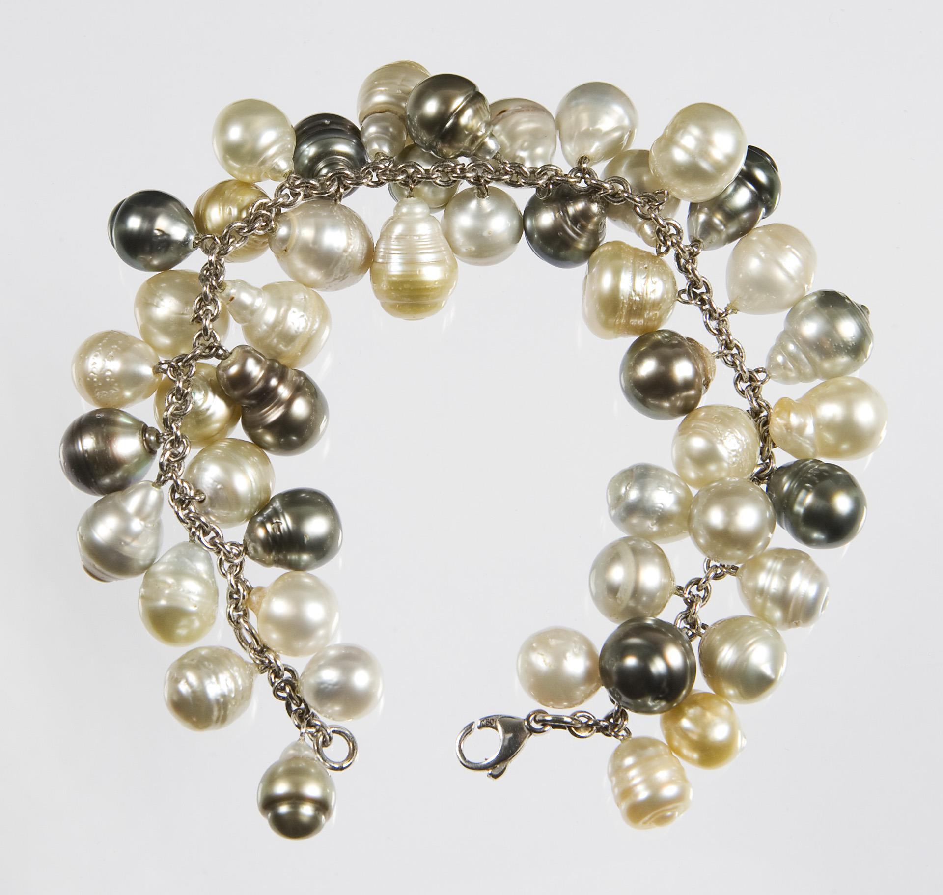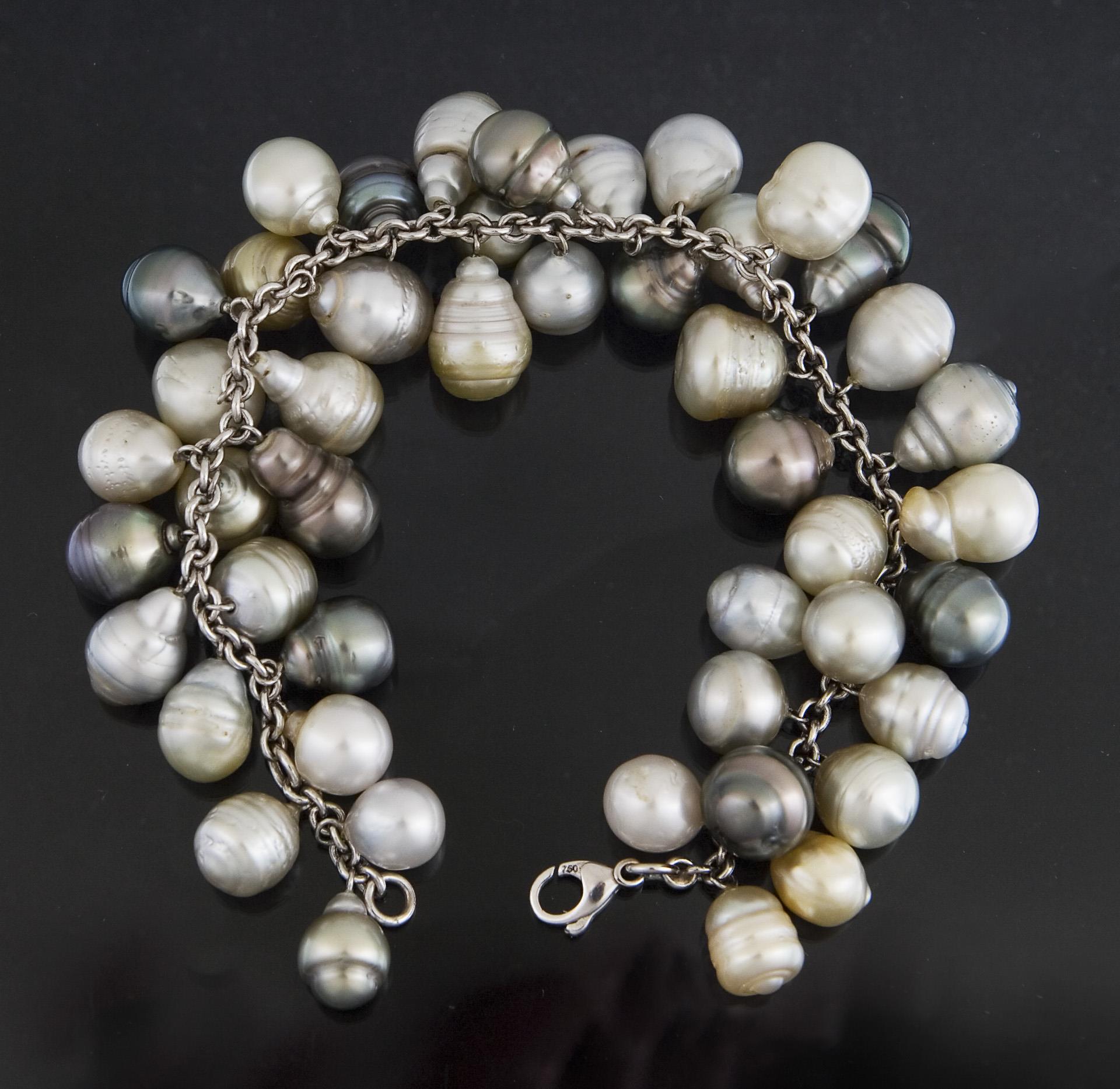 Charivari mit 46 Tahiti-Zuchtperlen und Südsee-Zuchtperlen in Barock-Form, Karabiner-Schließe, Punzen: Feingehalt.