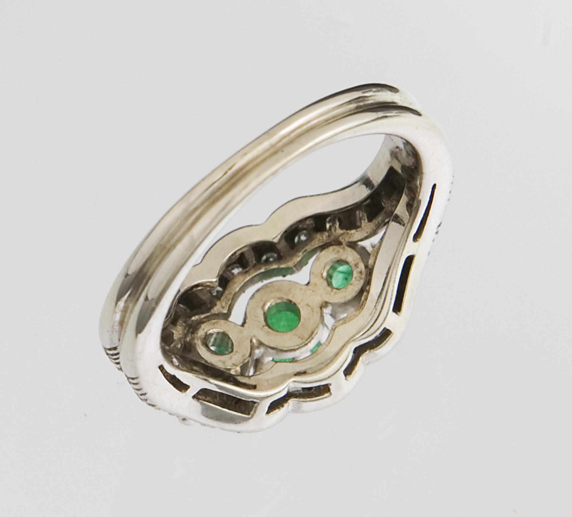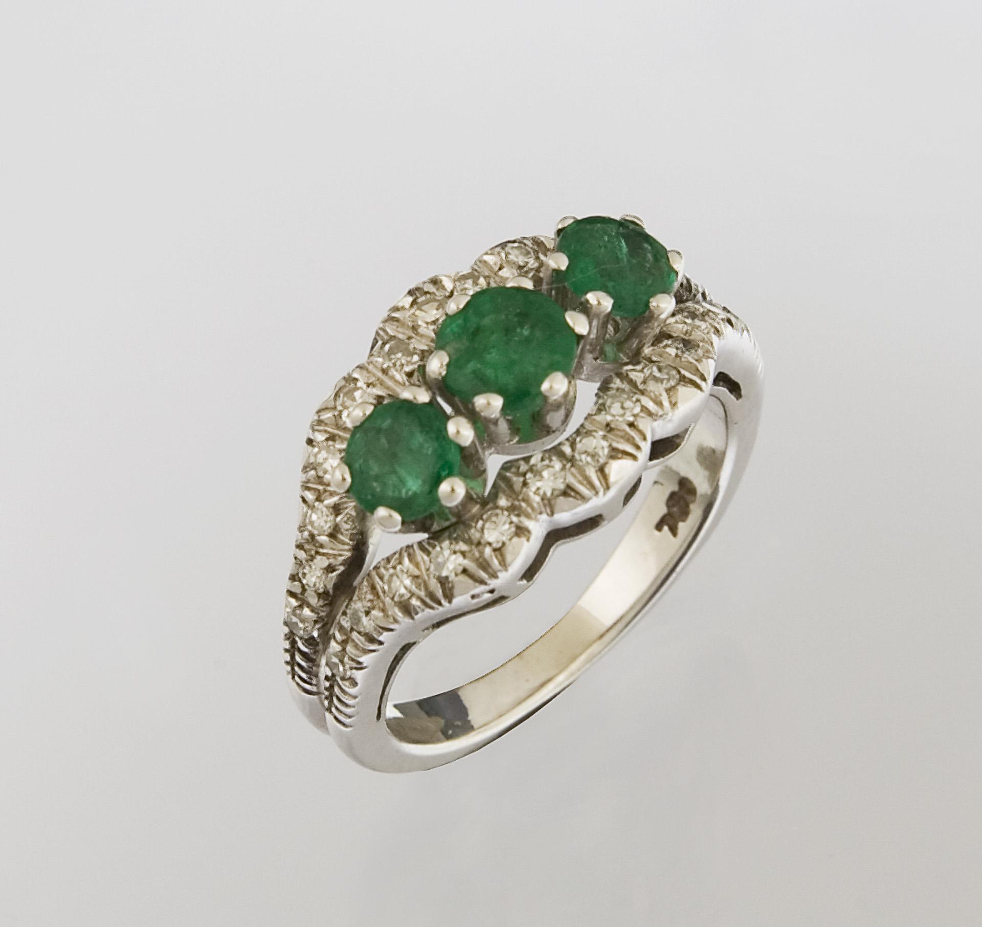 3 Smaragde in Krappenfassungen 1,3 ct, zahleiche kleine Diamanten 0,45 ct wesselton-pique, stabile gerillte Schiene, Punzen: Feingehalt.