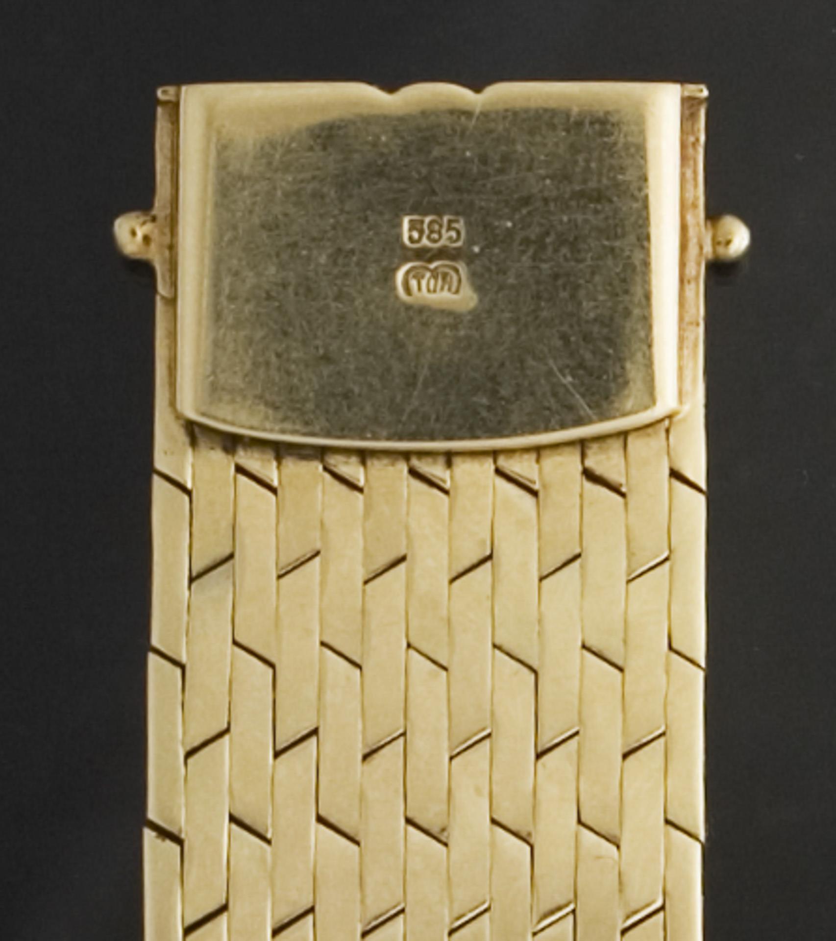 Feines Milanaiseband, Kastenschließe mit zwei Ösen. Punzen: Feingehalt, Juweliermarke.