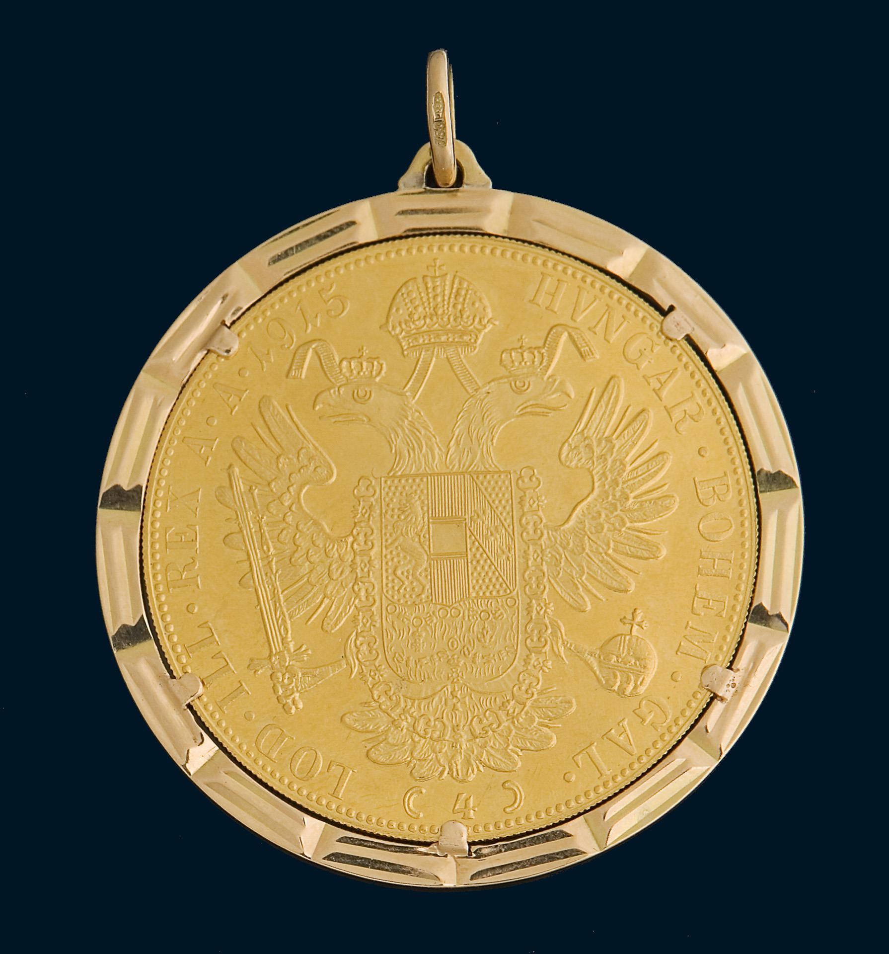 Vorderseite: Porträt mit Lorbeerblattkranz, Rückseite: bekrönter Doppelkopfadler. Nachprägung der Münze von 1915. Punzen: Fassung mit Feingehalt, italienische Juweliermarke.