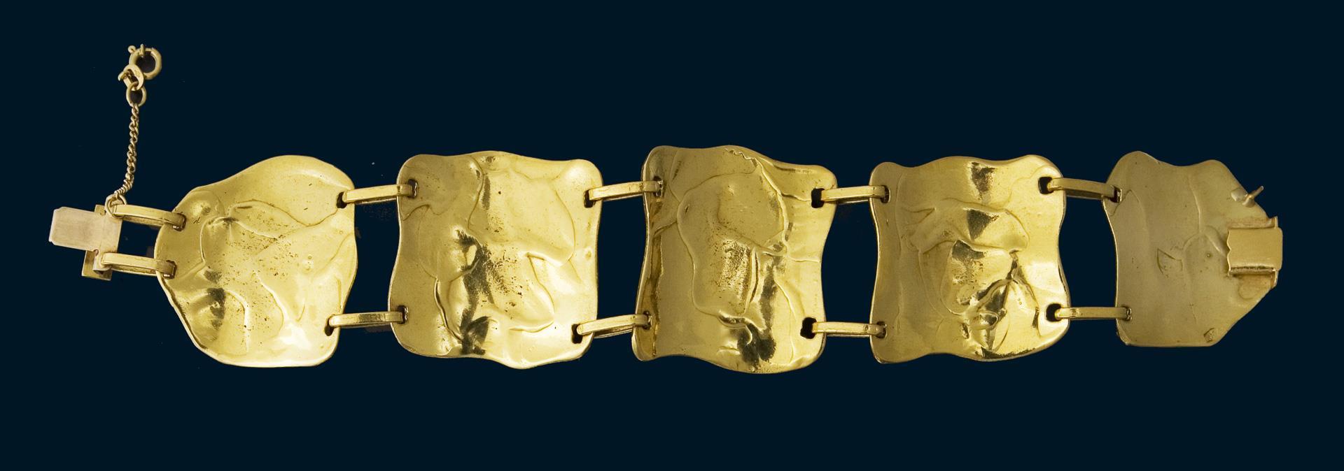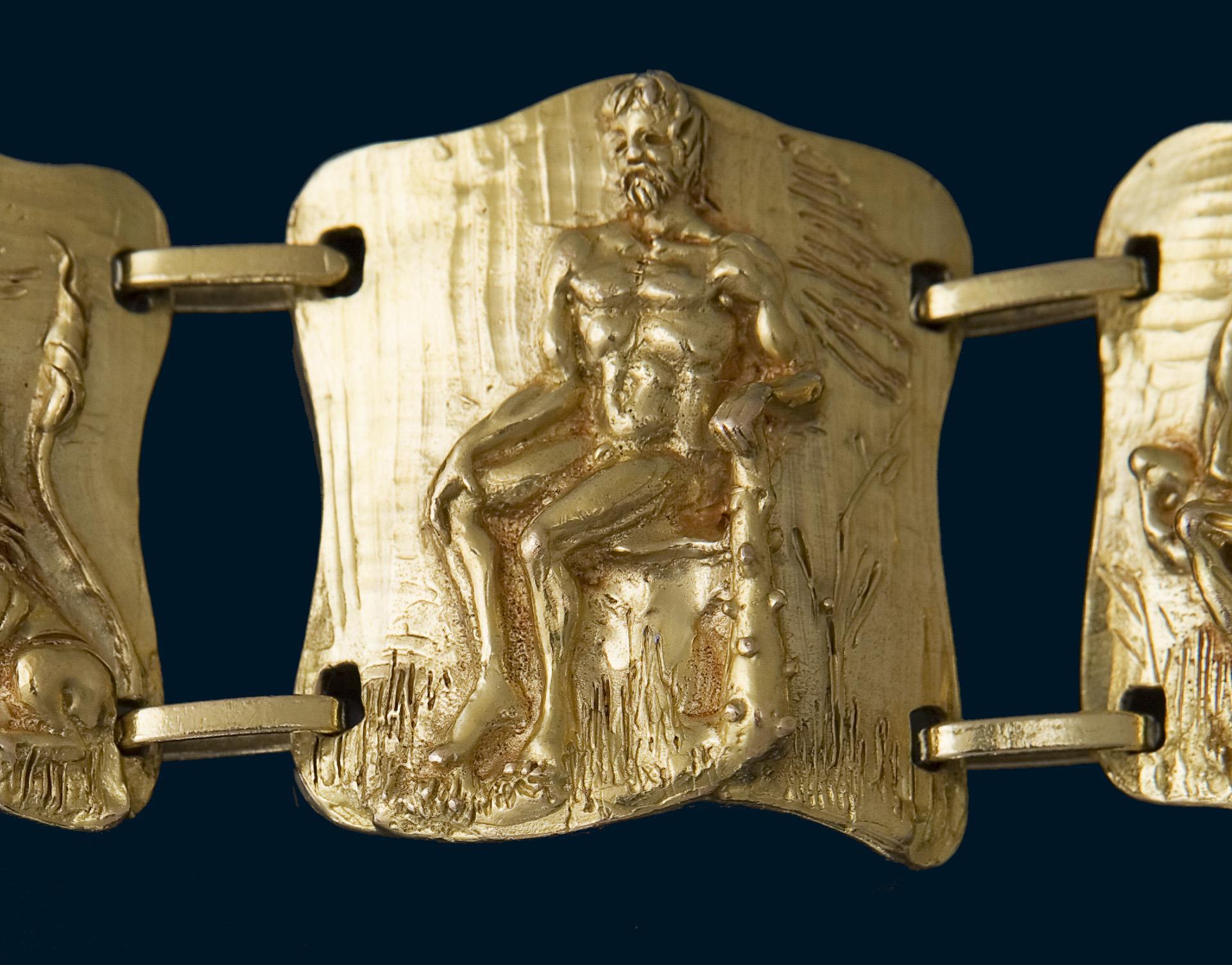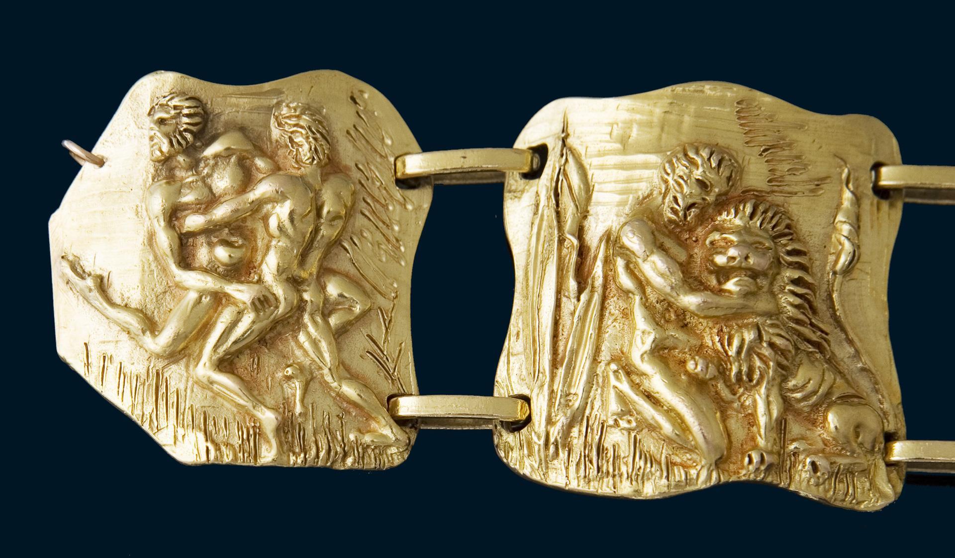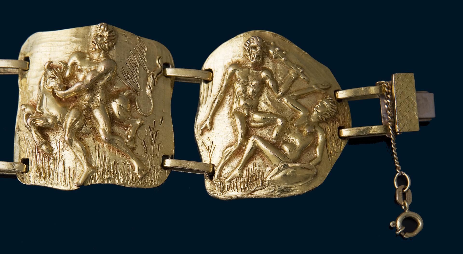 Massiv gearbeitet, fünf Glieder mit reliefierten Darstellungen von Herakles, Kastenschließe, Kettchen mit Federring. Punzen: Feingehalt, Juweliermarke Balestra.