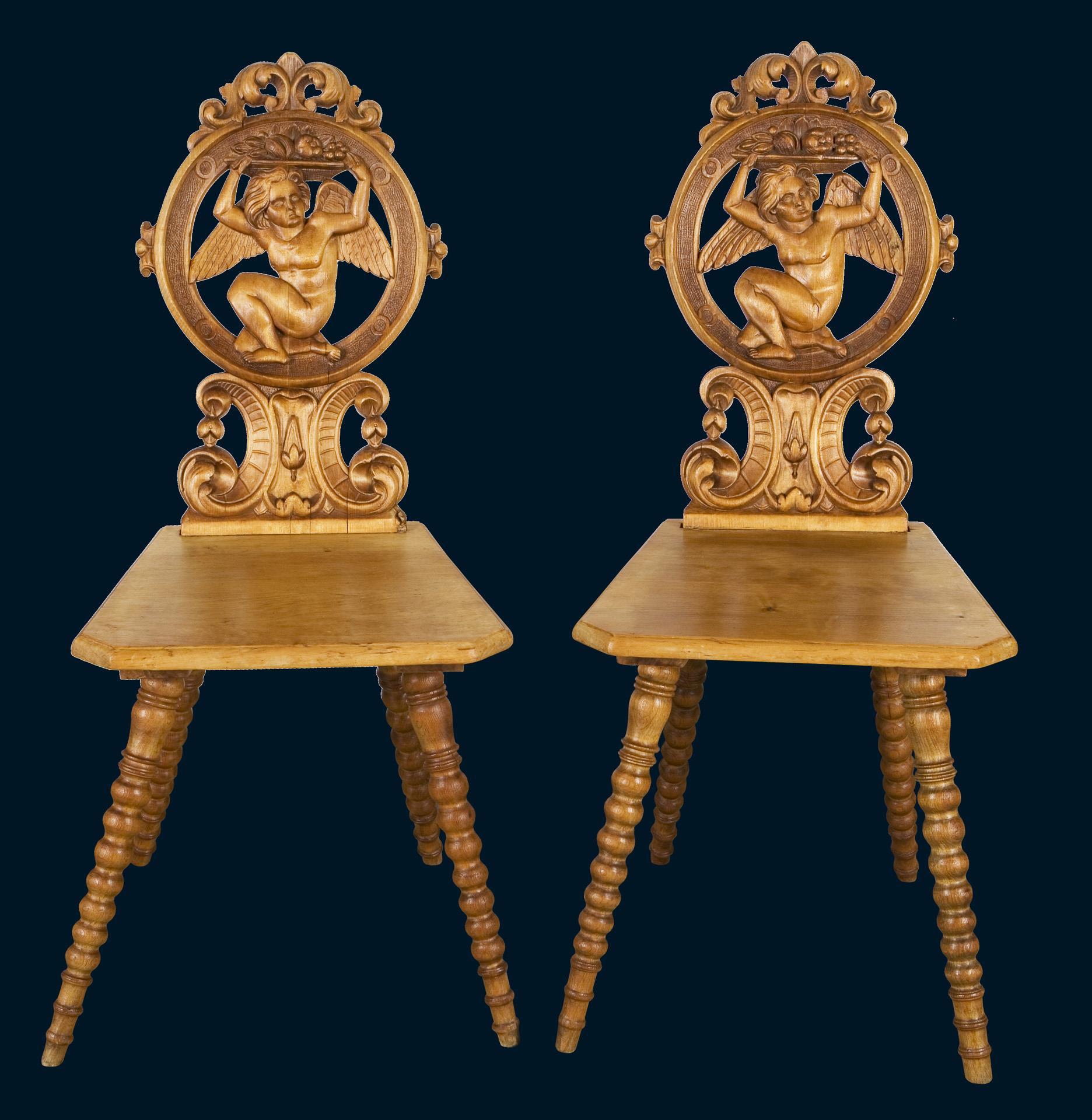 Durchbrochen gearbeitete, reich geschnitzte Lehne mit floralem, figürlichem und ornamentalem Dekor. In runden Kartuschen Amoretten mit ausgebreiteten Flügeln und Fruchtkorb. Trapezförmiger Sitz über vier ausgestellten gedrehten Beinen.
